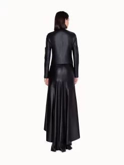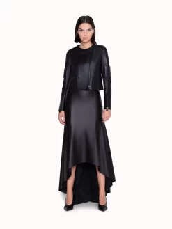 A long skirt to flatter your silhouette. With its A-line form, this skirt made of lamb nappa leather will complete your look in style. The asymmetrical hem is in the akris signature trapezoidal form. Pair it with a leather jacket for a casual yet elegant look.