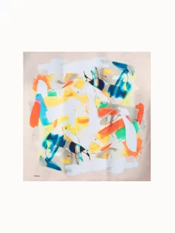 Brighten up any outfit with this multicolored silk scarf. Inspired by the look of paint strokes on paper, the neutral background of this scarf is offset by the pure joy of splashes of red, yellow, and blue. Measures 90 x 90 cm / 35.4 x 35.4 in.