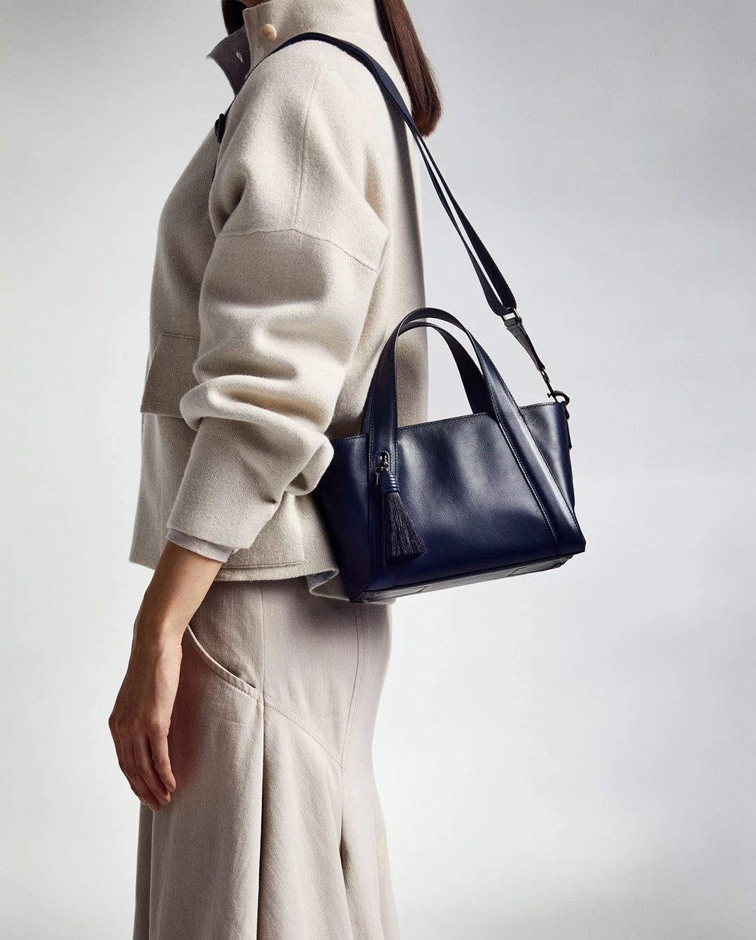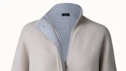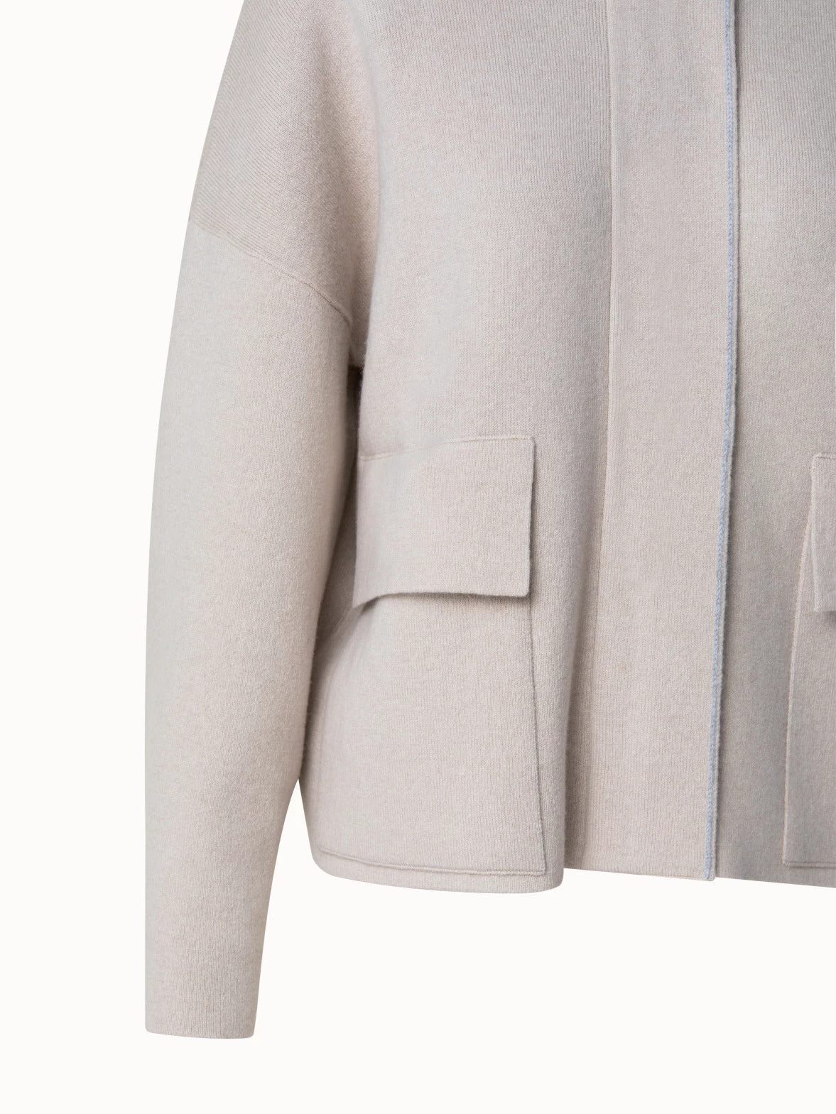 Bi color boxy knit cardigan in cashmere with stand up collar, zip closure, patch utility pockets. It has a