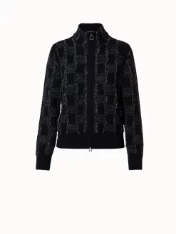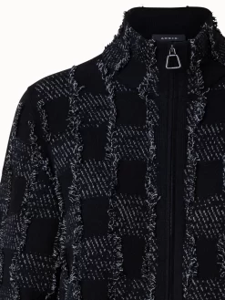 This Akris knit jacket is crafted in a cashmere cotton jacquard with square fringes that gives it a subtle volume and structure. This bomber jacket inspired style with a stand-up collar, zip closure, and pockets is ideal for casual use during spring and summer.