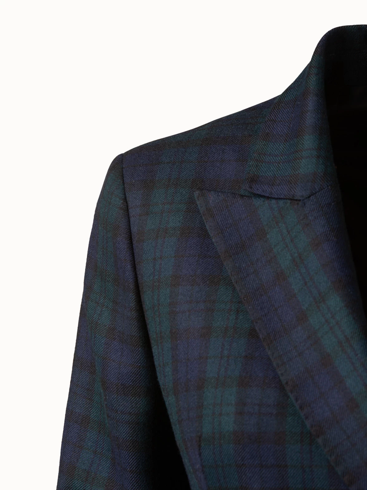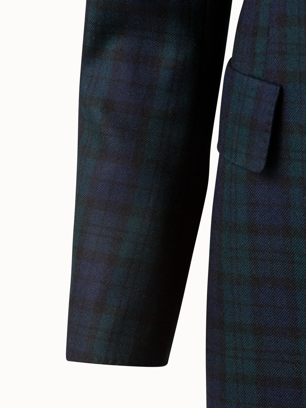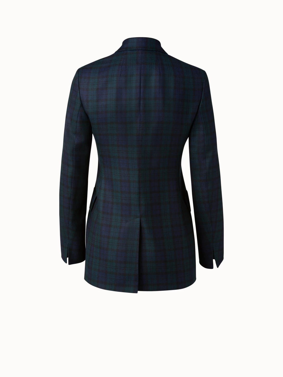 This double-breasted Akris long jacket Nadine is crafted in cozy checked cashmere. It is a tailoring staple with a peak lapel and flap pockets. Wear this blazer as a pantsuit with the matching pants and a dark blue blouse or a cashmere-silk knit pullover. In our handbag guide you can find the handbag for a modern business-look.