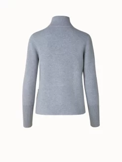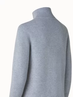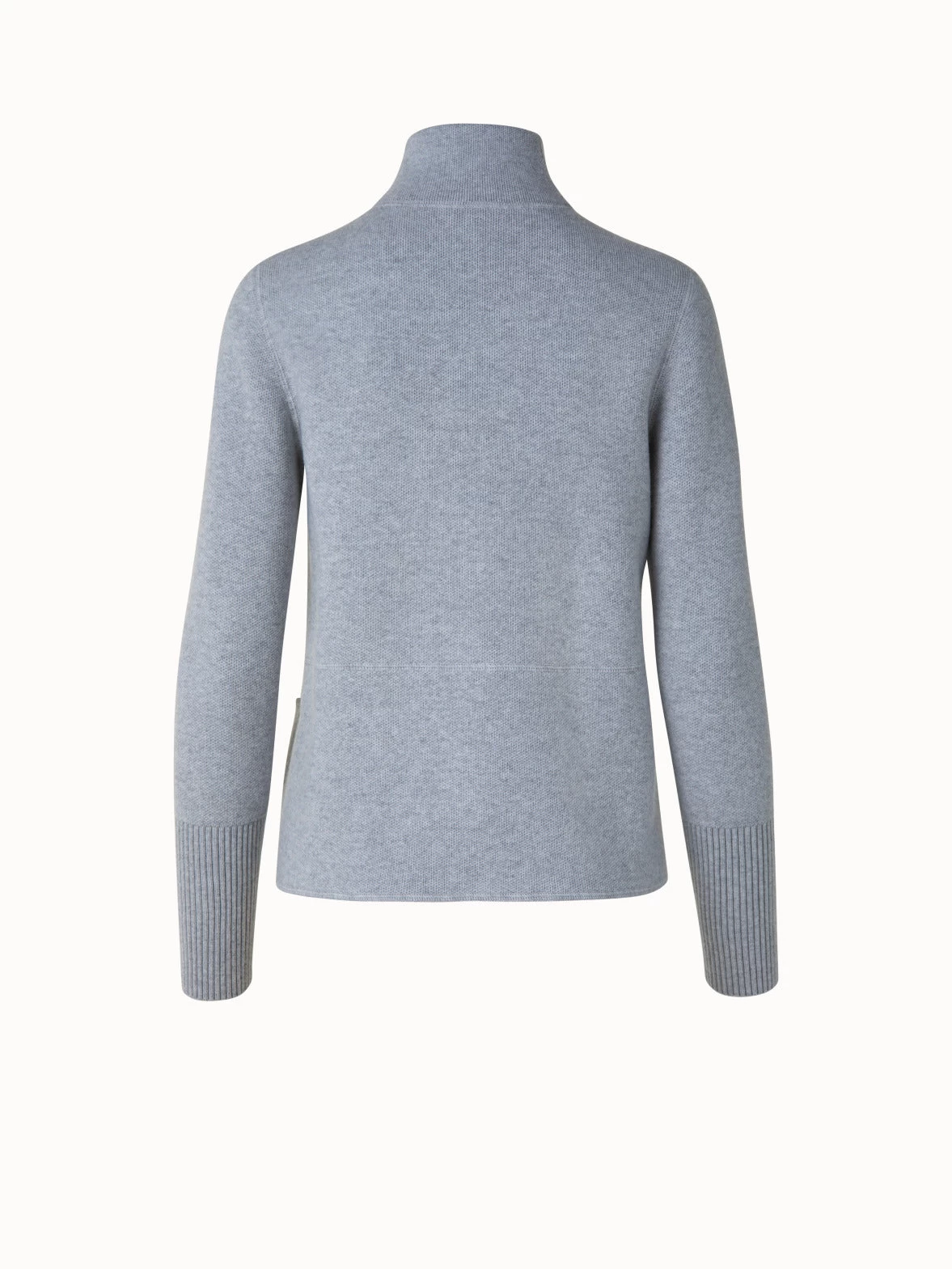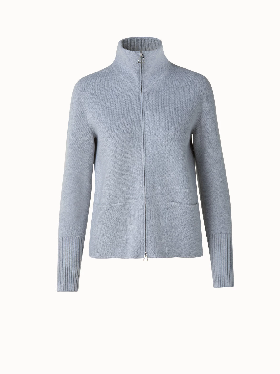 Casual knit cardigan in precious cashmere pique. Features stand up collar, zip closure, pockets and ribbed collar and cuff.