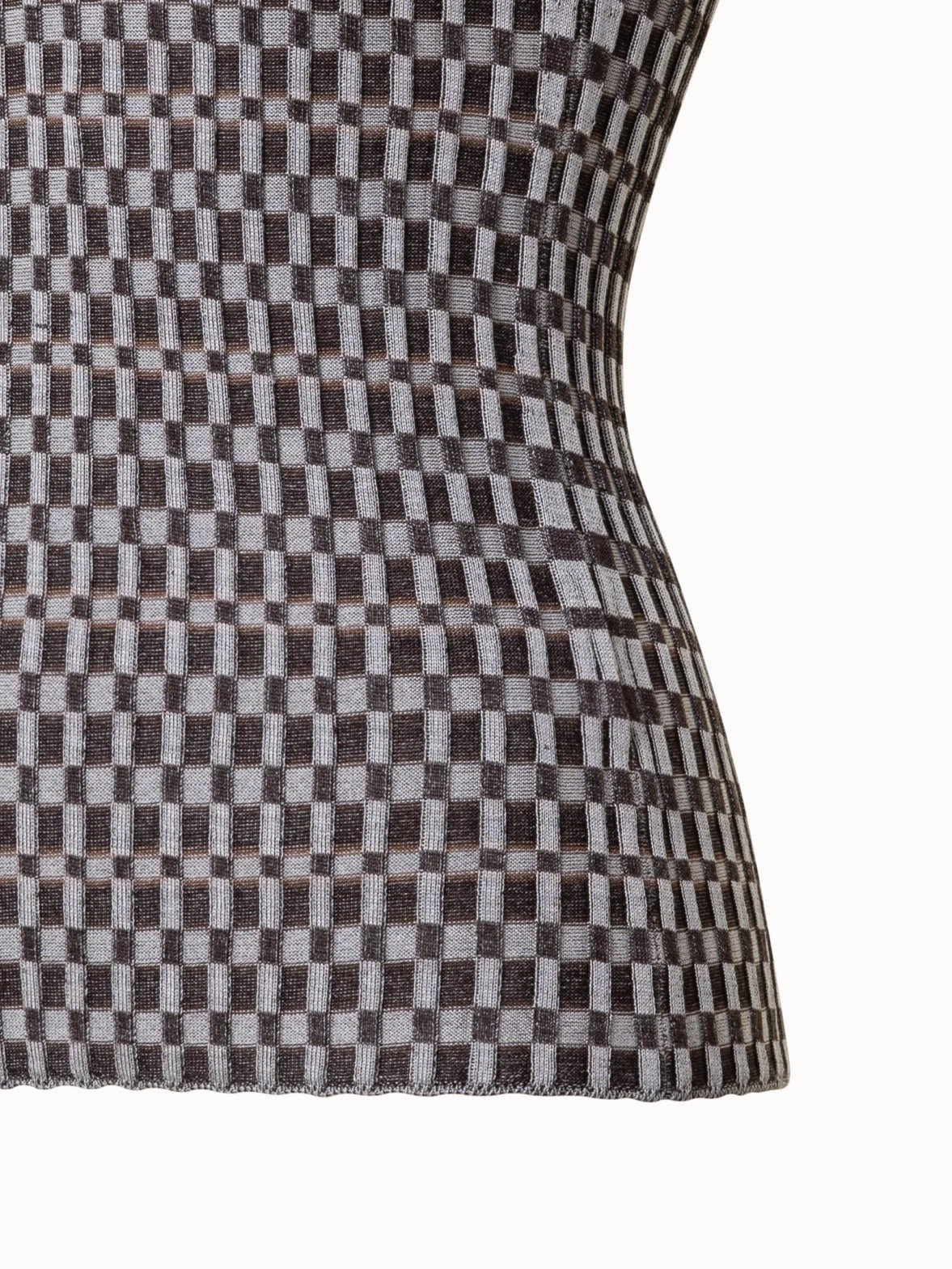 This Akris pullover is crafted in a structured check silk knit, creating a comfortable and elegant style that is perfect for spring and summer. The round neck, fitted silhouette, and short sleeves make it ideal for layering or as a versatile standalone piece.