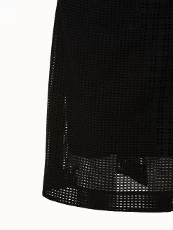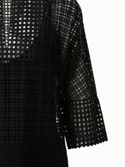 This Akris dress displays a modern take on cotton Broderie Anglaise with a geometric patchwork design. It features a round neck with slit, kimono sleeves, and zipped side slits that allow for a versatile silhouette. Includes a slip dress.