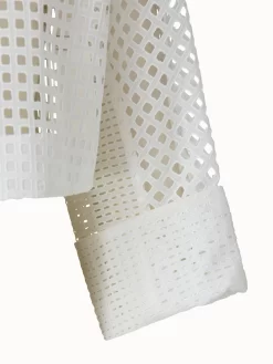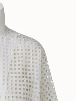 The Akris short jacket Mimi is a statement piece crafted in cotton Broderie Anglaise patchwork, making it light enough for warm summer days. The relaxed a-line shape with back pleat and kimono sleeves with wide cuff create a voluminous silhouette. The stand-up collar and zip closure underline the modern fabric and cut.