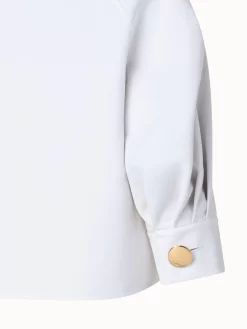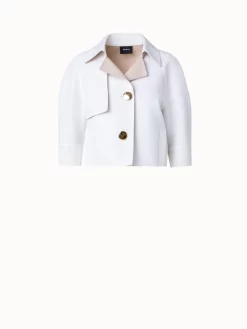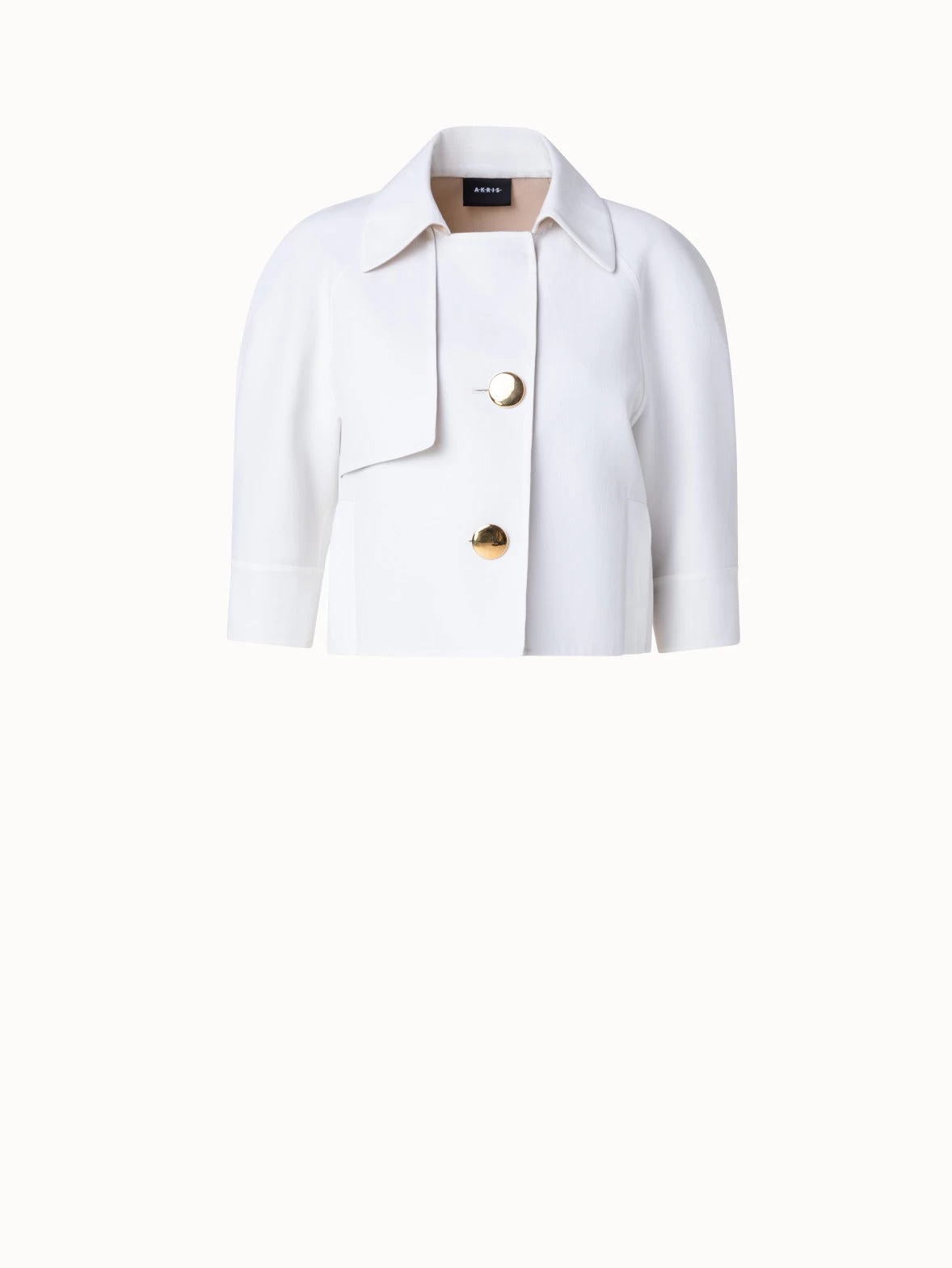 This Akris jacket is crafted in cotton double-face, making it an ideal choice for spring and summer while showcasing the signature craftsmanship of the house. It is cut for a boxy fit that layers perfectly with high-waisted bottoms or a dress. The strong shoulder and golden buttons pay homage to archival designs from the 1980s, which inspired creative director Albert Kriemler for the Spring 2023 collection, celebrating 100 years of Akris.