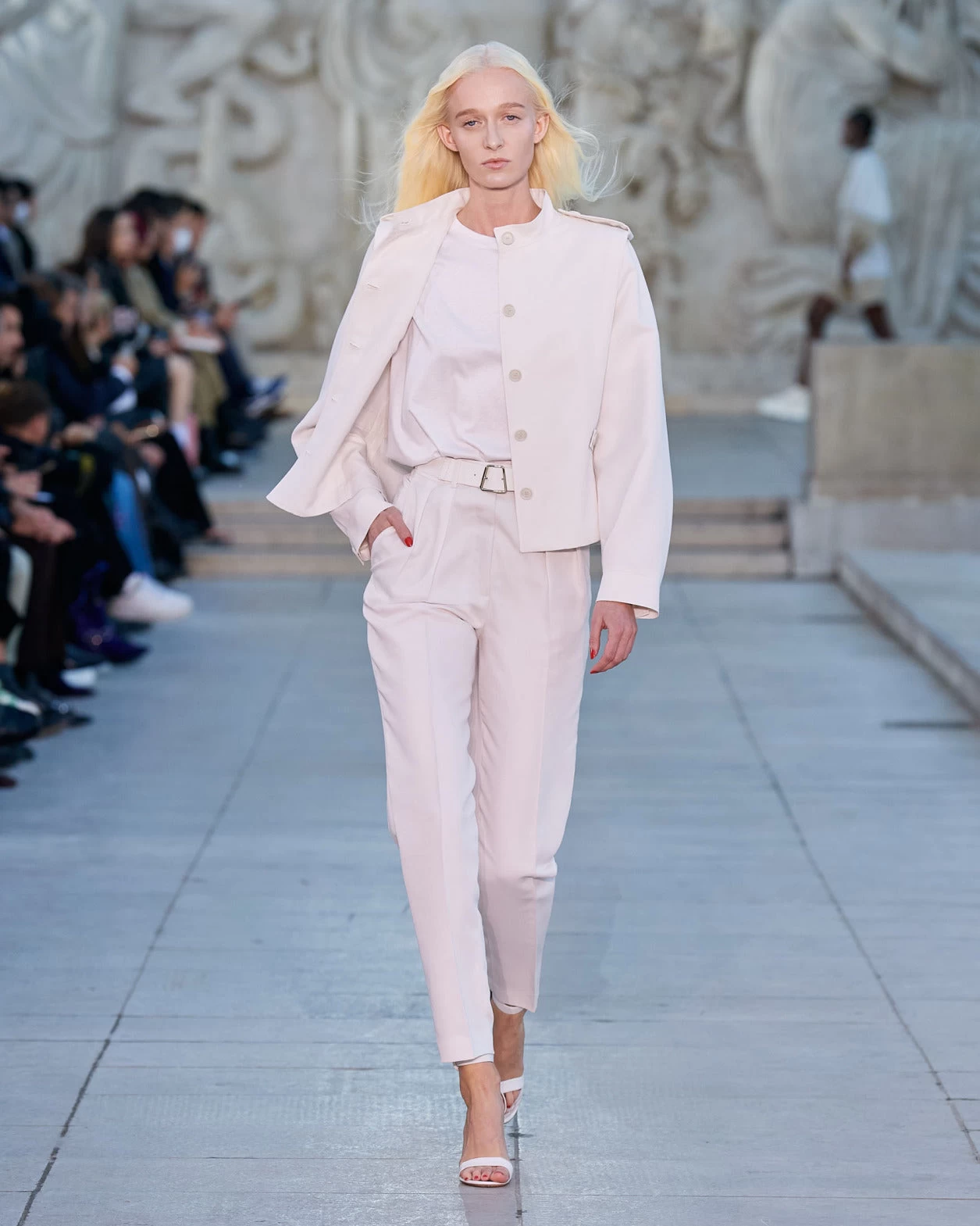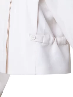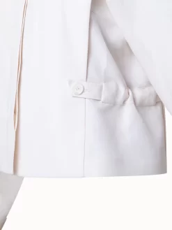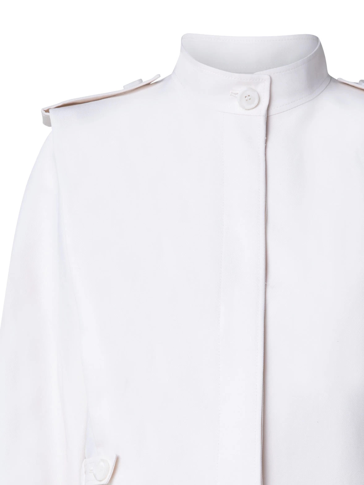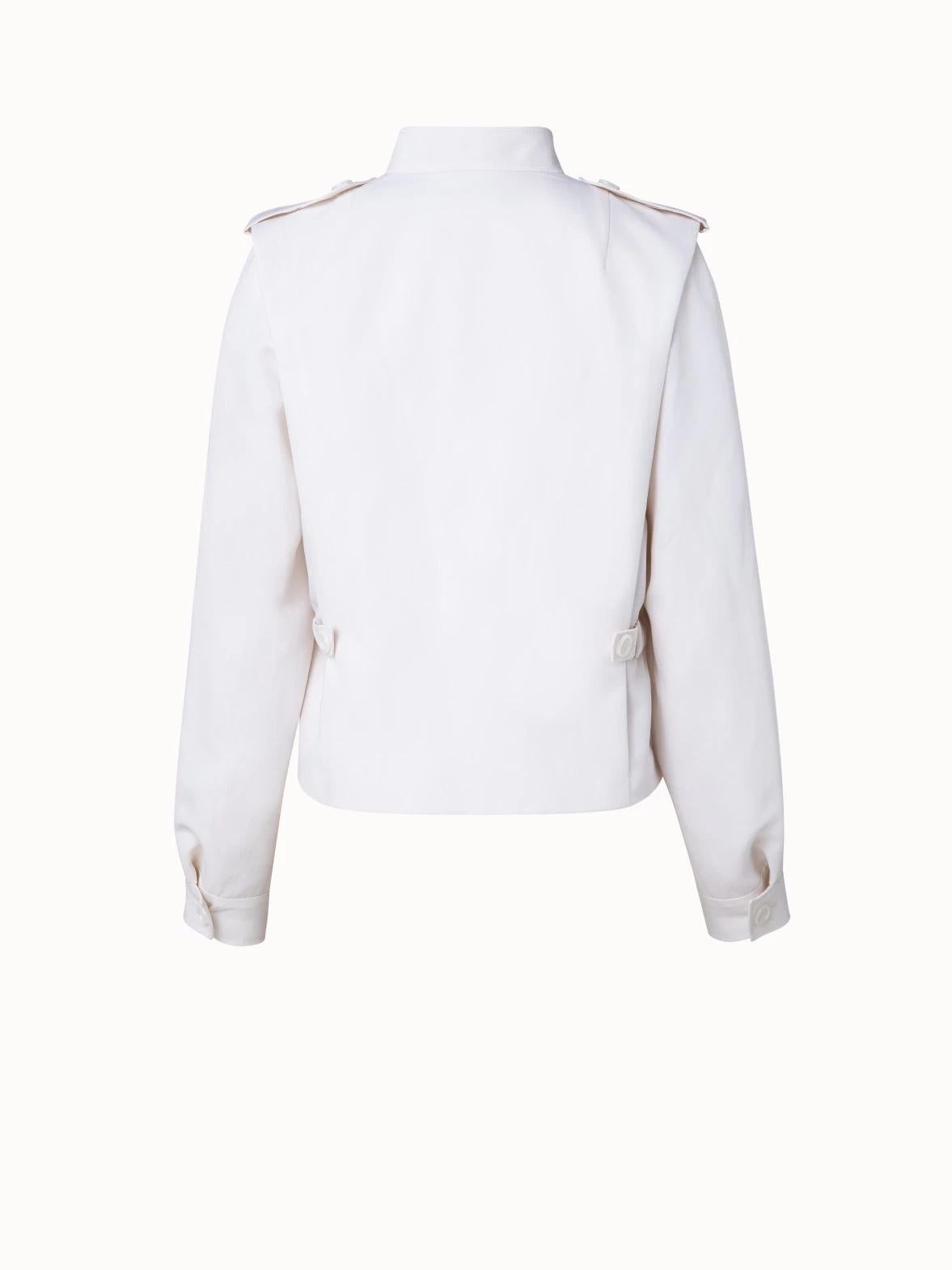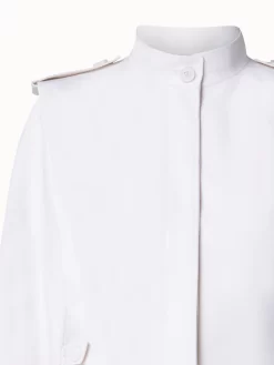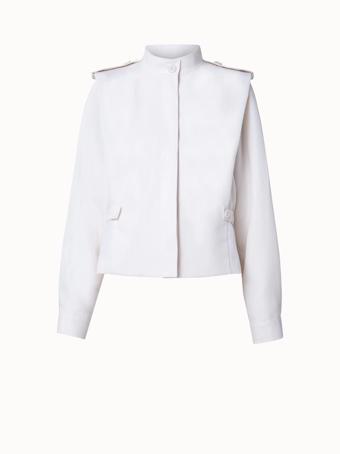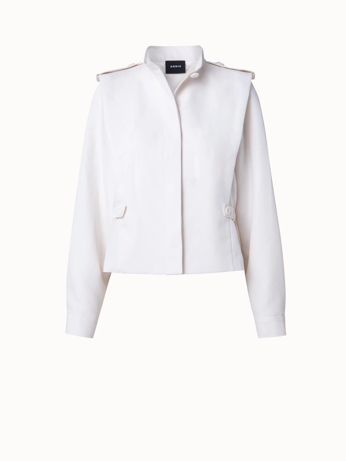 As part of the 100 year anniversary of the house, the Akris jacket Gregory is a revival of a vintage silhouette by creative director Albert Kriemler from the 1980s. This military-inspired style is crafted in a cotton linen blend, making it versatile for every occasion in spring and summer. The body is cut for a strong shoulder that is accentuated by tabs and a taken-in waist through a buttoned side tab that subtly gathers the fabric. A mock neck, covered button closure, and cuffed sleeves complete this sleek style.