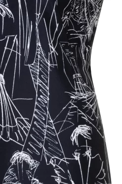 Displaying sketches by creative director Albert Kriemler, the Croquis print showcased on this sheath dress of Akris Spring 2023 tells a very personal story. Witty and charming, it was designed by his team as an anniversary surprise.