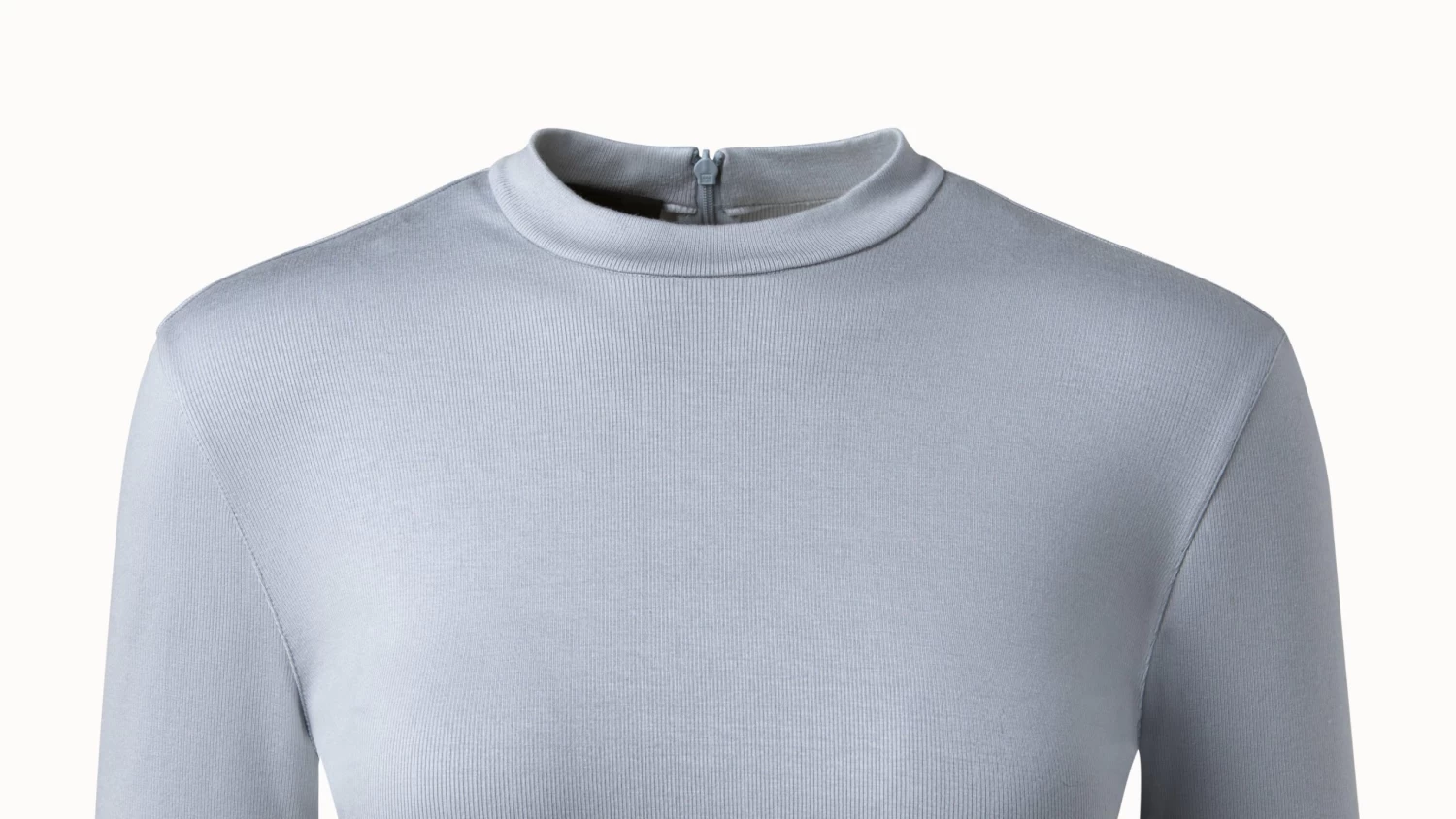 A sleek and streamlined cotton silk jersey top perfect for layering under a jacket. The slight mock neck style has a back zip closure, fine rib structure, and long sleeves.