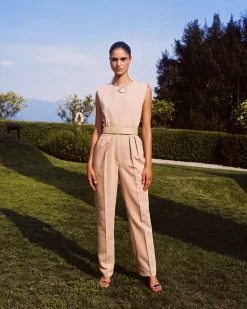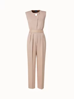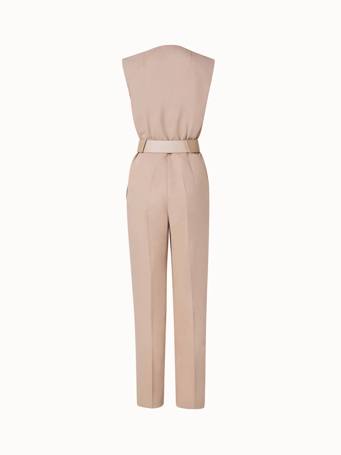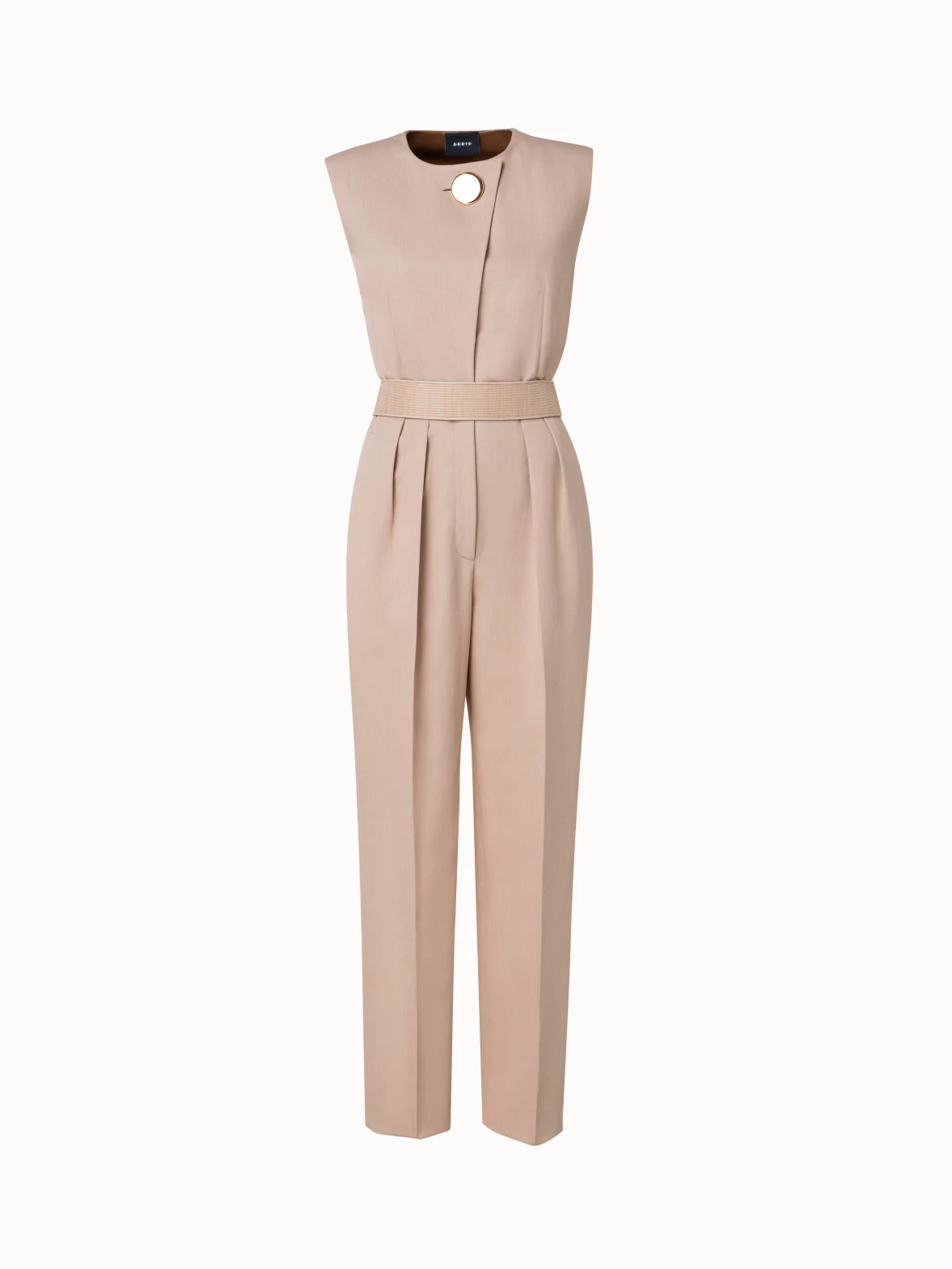 This sleeveless Akris jumpsuit is crafted in cotton silk serge, making it an elegant choice for spring and summer occasions. The gold button and shoulder pads showcase the vintage inspiration of the Spring 2023 collection and create a strong look. Front pleats create a flattering waist that is accentuated by the horsehair belt.