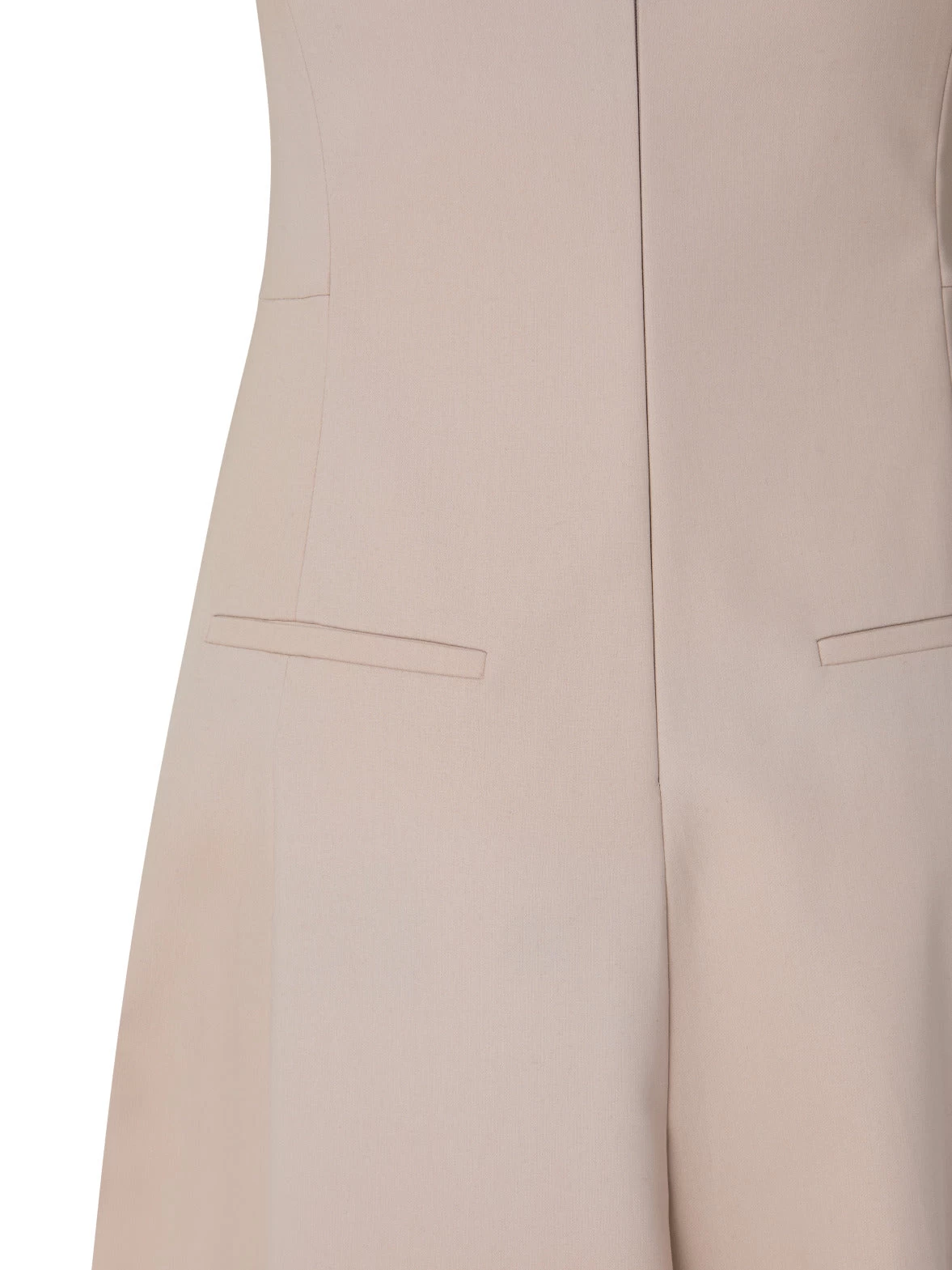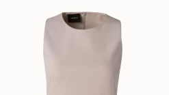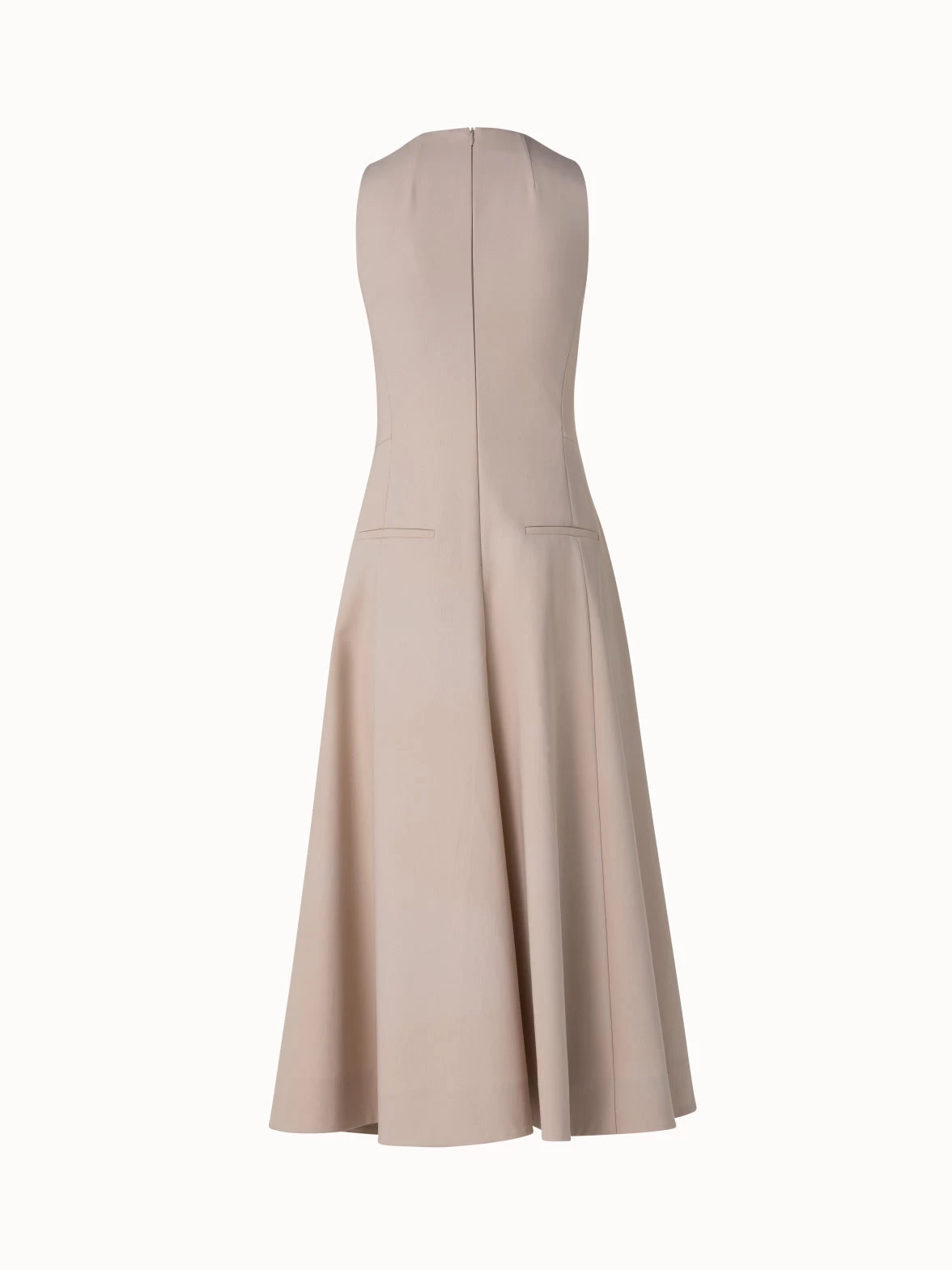 Sleeveless round neck midi dress in cotton twill has fitted top and full skirt with side pockets.