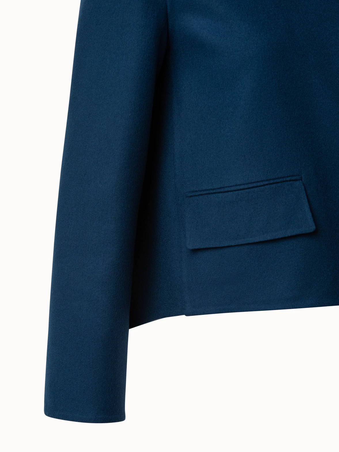 This sharp and tailored jacket pairs well over a pair of pants. Two top buttons decorate the front, while a covered panel hides the rest of the front buttons. Features flap pockets and a back box pleat.