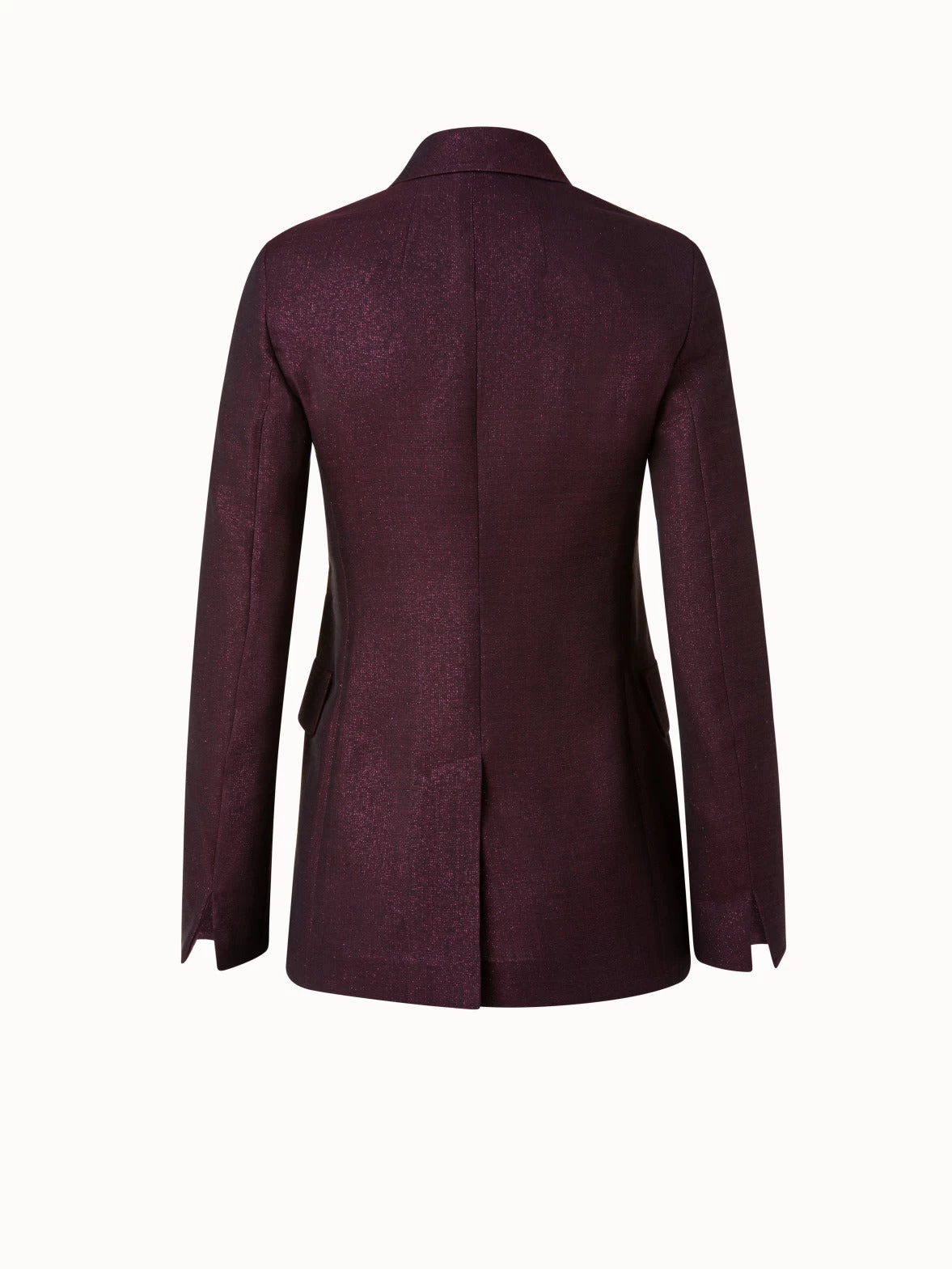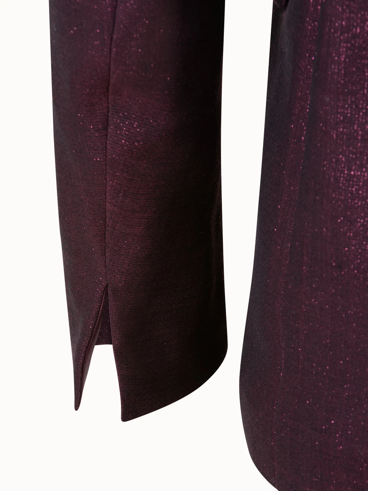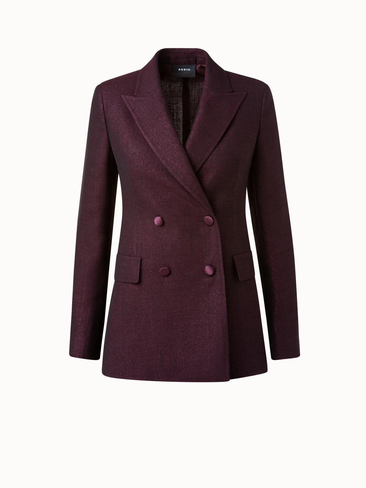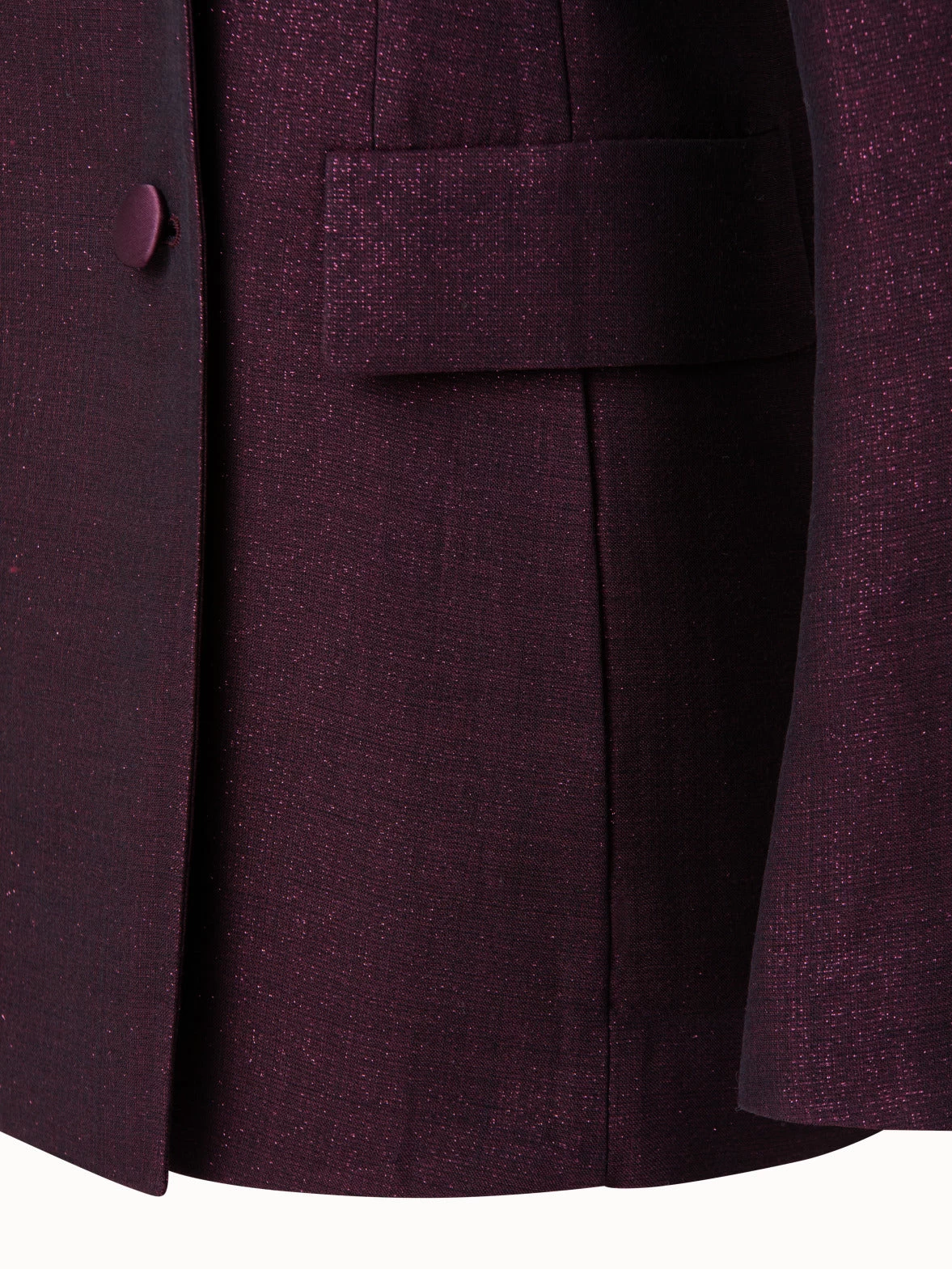 The sharply tailored Nadine jacket is offered this season in a gorgeous wool lurex. Designed with a peak lapel and double breasted button detail, this long jacket and the matching Farida pant creates the perfect modern tuxedo.