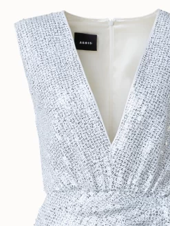 This Akris dress will make you stand out. Crafted in two-tone sequins on tulle stretch, it creates a unique look while ensuring comfort on any occasion. Shoulder pads showcase the vintage inspiration of the Spring 2023 collection and create a strong look. The deep V-neck and skirt with asymmetrical overlayer create a feminine silhouette.