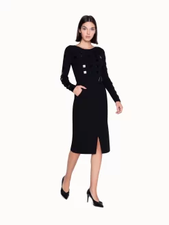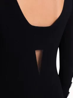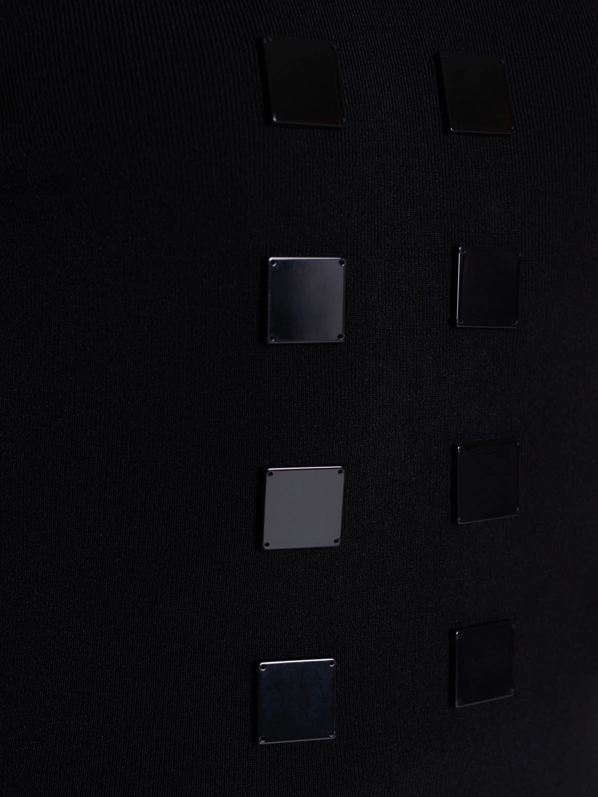 Add some shine to your outfit with this embellished knit pullover. The square stone detailing on the front of this sweater spruces up a basic black outfit, while the plunging back cutout adds a sensual twist. Easy to dress up or down, this pullover can be worn in the office with a jacket thrown over it, or to an evening soiree.