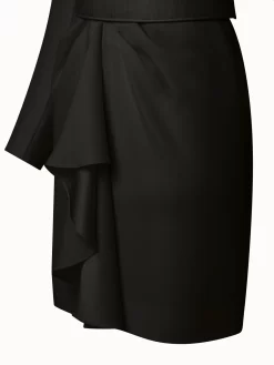 This Akris dress is crafted in a soft, flowing envers satin. The deep V-neck and skirt ruffles create an elegant and feminine look. The signature horsehair belt accentuates the waist. This dress closes with a back zip.