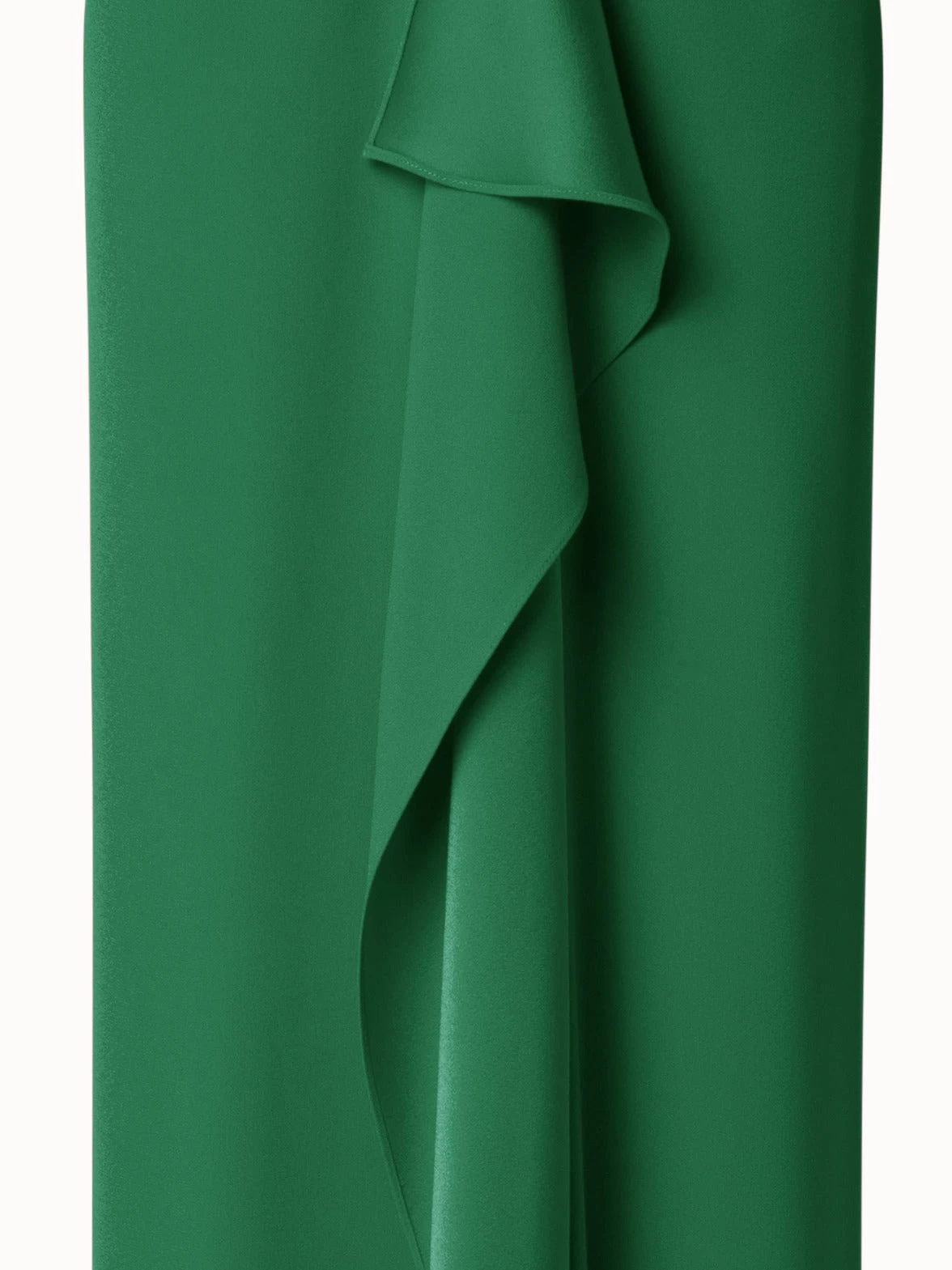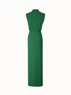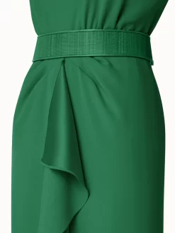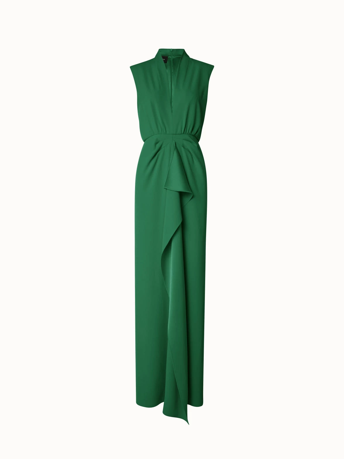 This Akris gown is an elegant piece that is perfect for formal occasions and events. Crafted in flowing envers satin, this gown features a deep V-neckline, front skirt drape, and sleeveless design for a sleek and sophisticated look. The dress comes with an included horsehair waist belt, adding texture and definition to the waistline. This gown is sure to make a statement at any event.