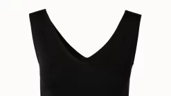 This dynamic knit tank top is crafted from silk stretch and cut for a fitted silhouette with front and back V-neck. It is a perfect match for high-rise separates and a contemporary casual summer look.