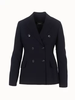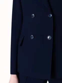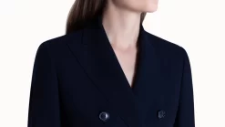 A versatile classic. This double breasted jacket in cool wool and stretch for comfort even in long meetings has a peak lapel. Wear it to work as a business smart pant suit with the matching pant. Combine it with the iconic Akris Ai bag in navy leather to complete your statement look.