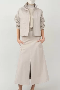 This mixed media mock neck tunic features a silk front and knitted back and cap sleeve. It has a convenient back zip closure and side slits for a relaxed shape.