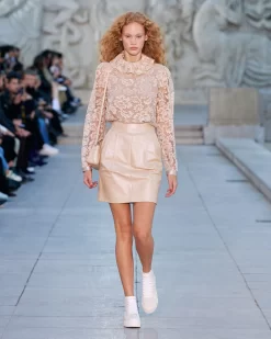 This Akris blouse is inspired by vintage designs of creative director Albert Kriemler from the 1980s. It is crafted in a two-tone viscose lace that creates a sophisticated look and showcases Akris’ craftsmanship. The ruffle collar is detachable, allowing for versatile styling of this blouse. The long sleeves feature gathered shoulders, creating a stong look.