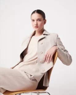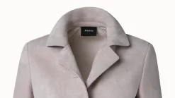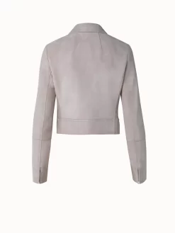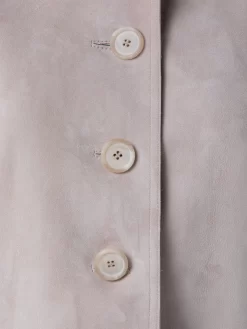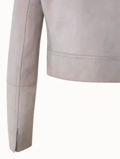 Short fitted jacket in lamb suede with water repellent treatment has shirt collar and button closure.