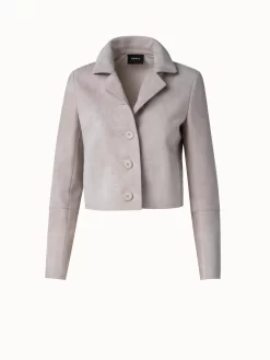 Short fitted jacket in lamb suede with water repellent treatment has shirt collar and button closure.