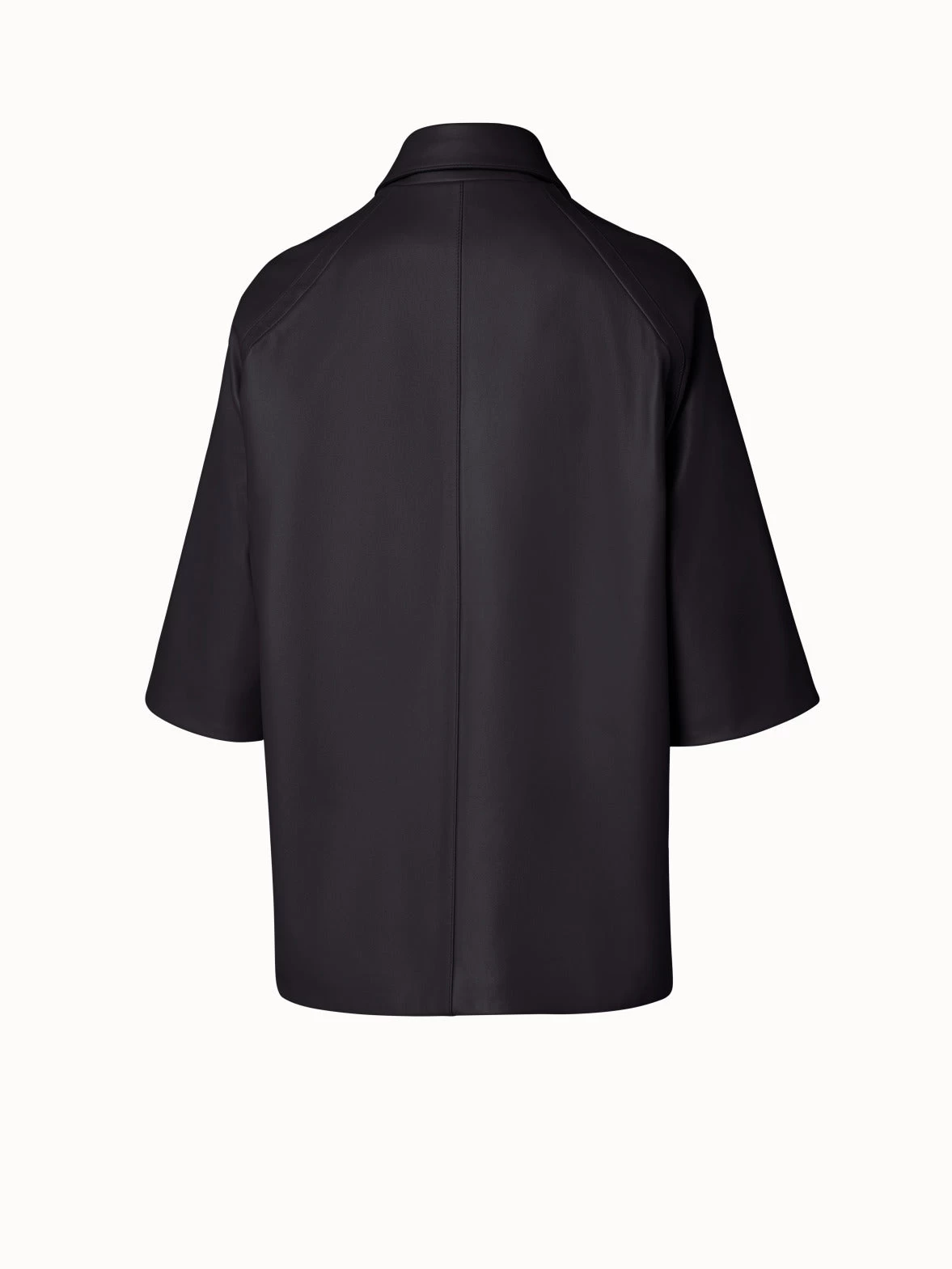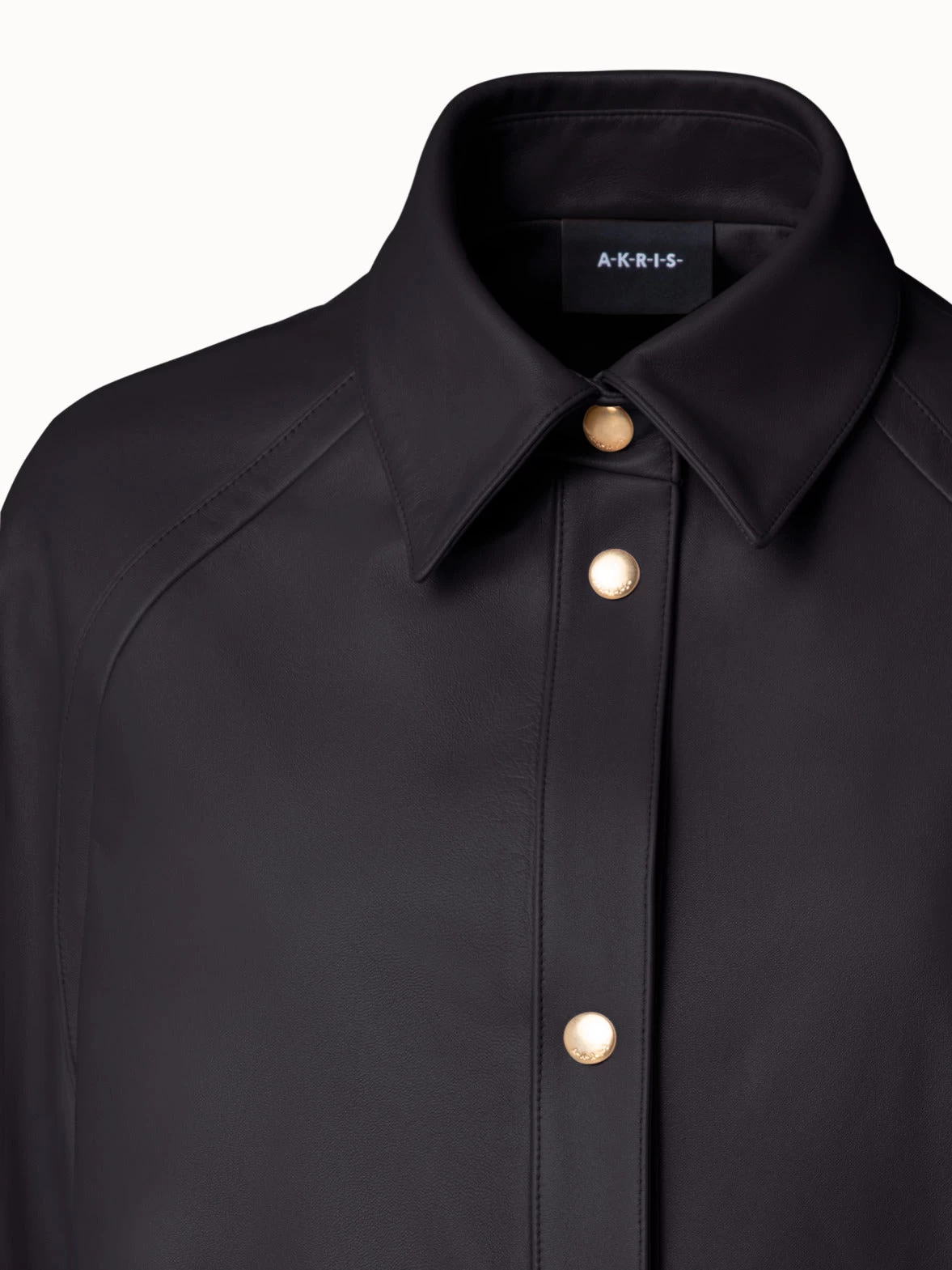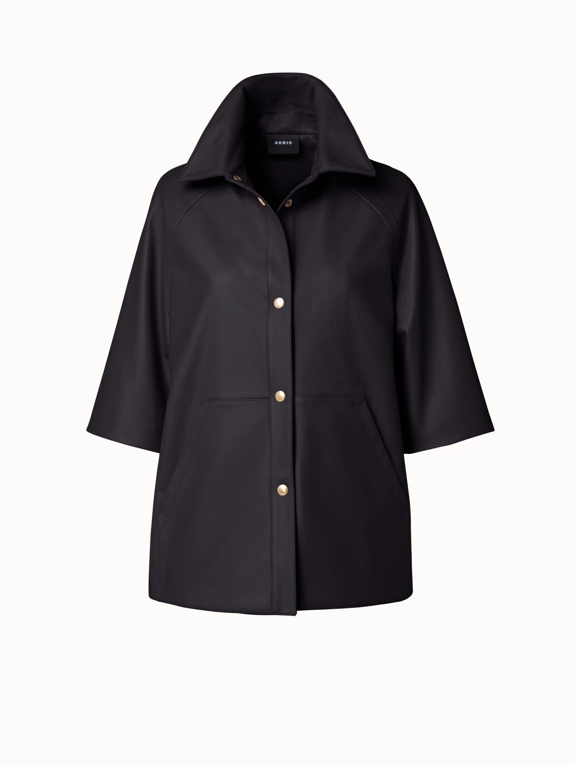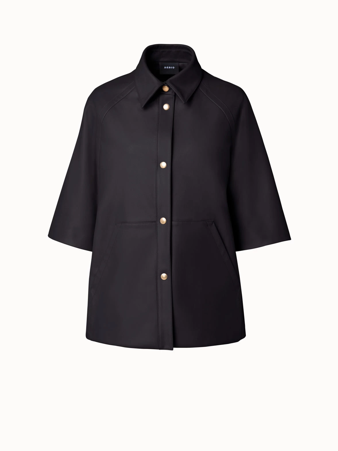 A sleek and modern silhouette, this Akris leather jacket Gina is crafted in a matte lambskin. It features a shirt collar, gold snap-button closure, and elbow-length sleeves, making it a versatile style for spring and summer. Zip pockets add functionality.