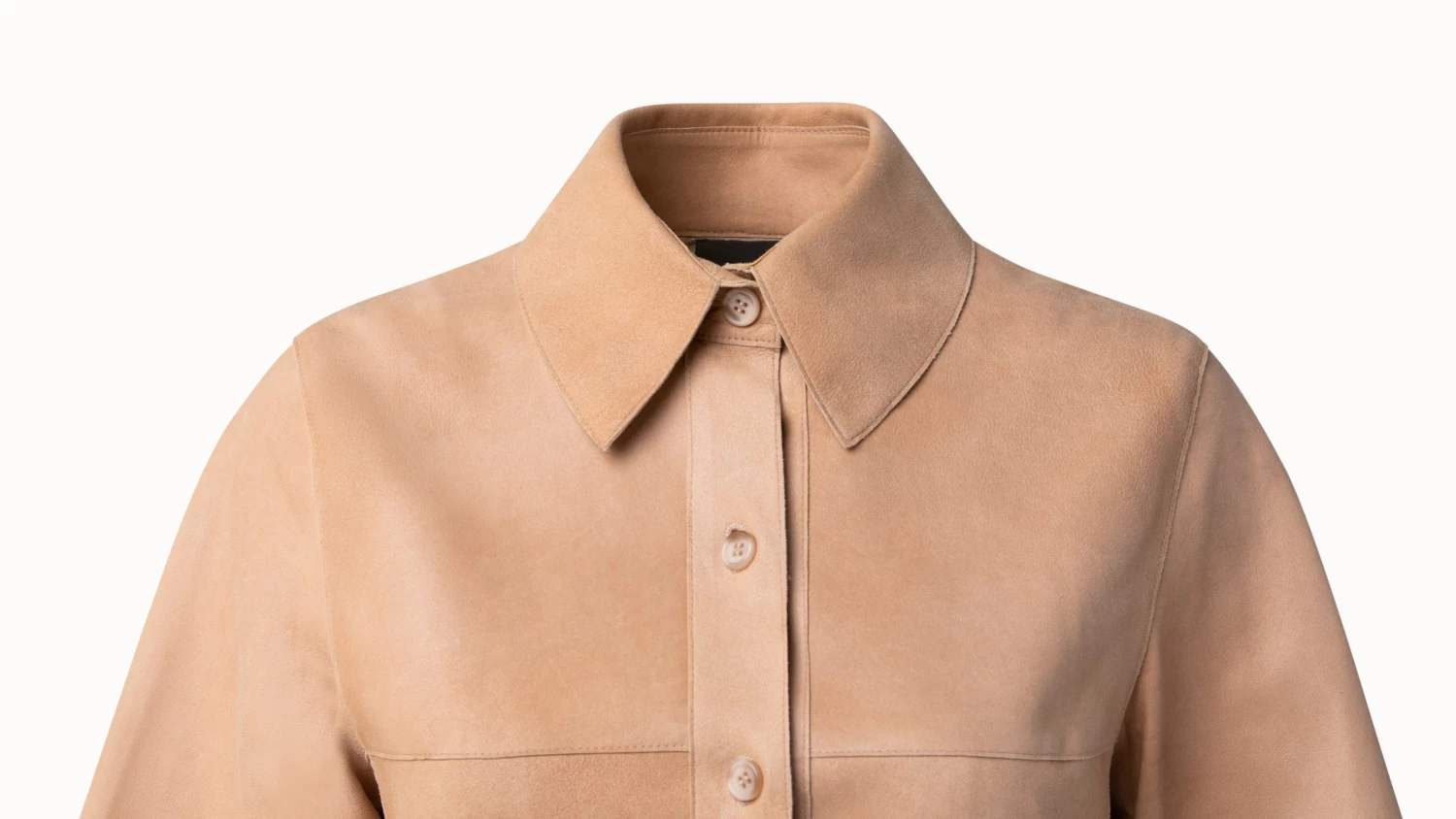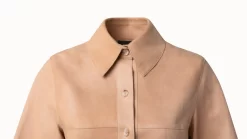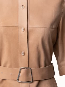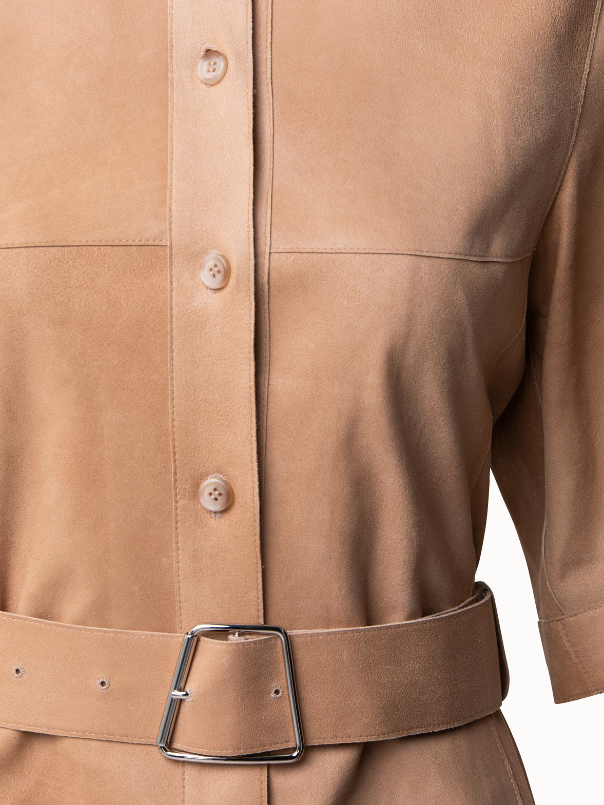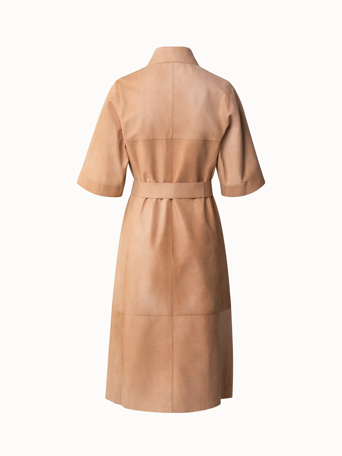 This calf velour leather shirt dress has the look of a polo shirt combined with a shirtdress silhouette. The leather gives the dress even more of a unique look. The wide sleeves offset the shape of the rest of the dress. Can be worn with or without the belt.
