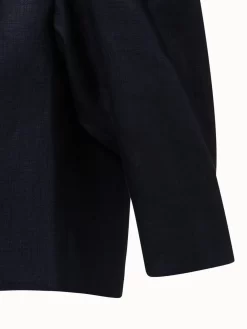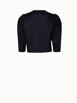 The Akris short jacket Maya is a chic and feminine piece, perfect as a topper in spring and summer. Crafted in linen double-face, it will be comfortable on warm days while looking impeccably elegant. Inspired by vintage Akris looks from the 1980s, it features strong, padded shoulders and elbow-length puff sleeves that create a stand-out look. It is designed with a round neck and no closure.