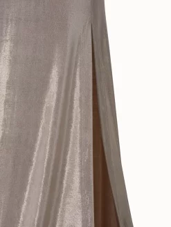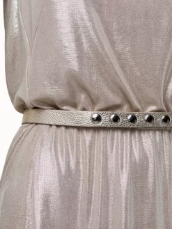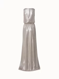A new, modern gown crafted in a stunning stretch liquid jersey. This tank style gown has effortless ease, thanks to its blouson top with elastic waistband. The column skirt features a high side slit and a metallic leather belt with logo studs polishes the look.