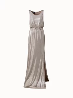 A new, modern gown crafted in a stunning stretch liquid jersey. This tank style gown has effortless ease, thanks to its blouson top with elastic waistband. The column skirt features a high side slit and a metallic leather belt with logo studs polishes the look.