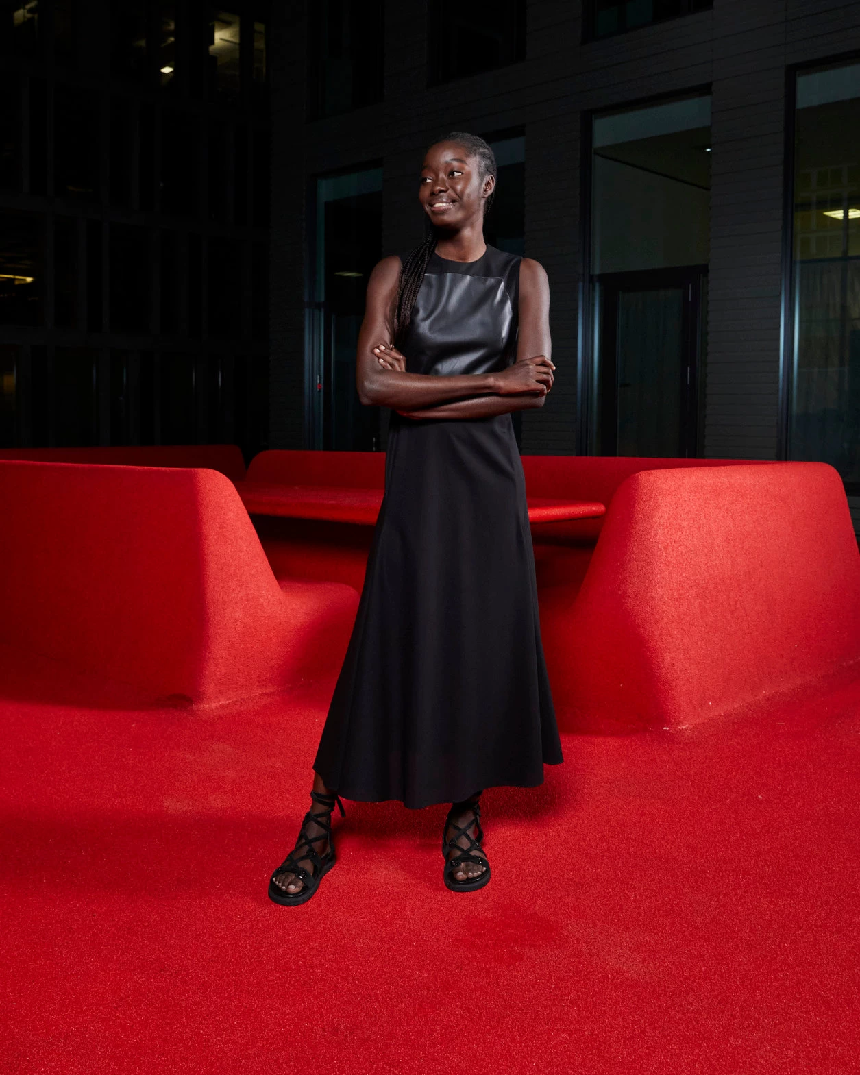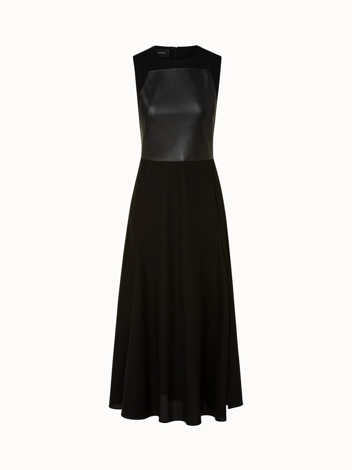 This long dress shows a modern combination of classic fabrics in a new silhouette. The dress is crafted from cotton twill and features a leather apron bodice. Its round neck and timeless silhouette fall to a long flared skirt, making it an impeccably crafted signature piece.
