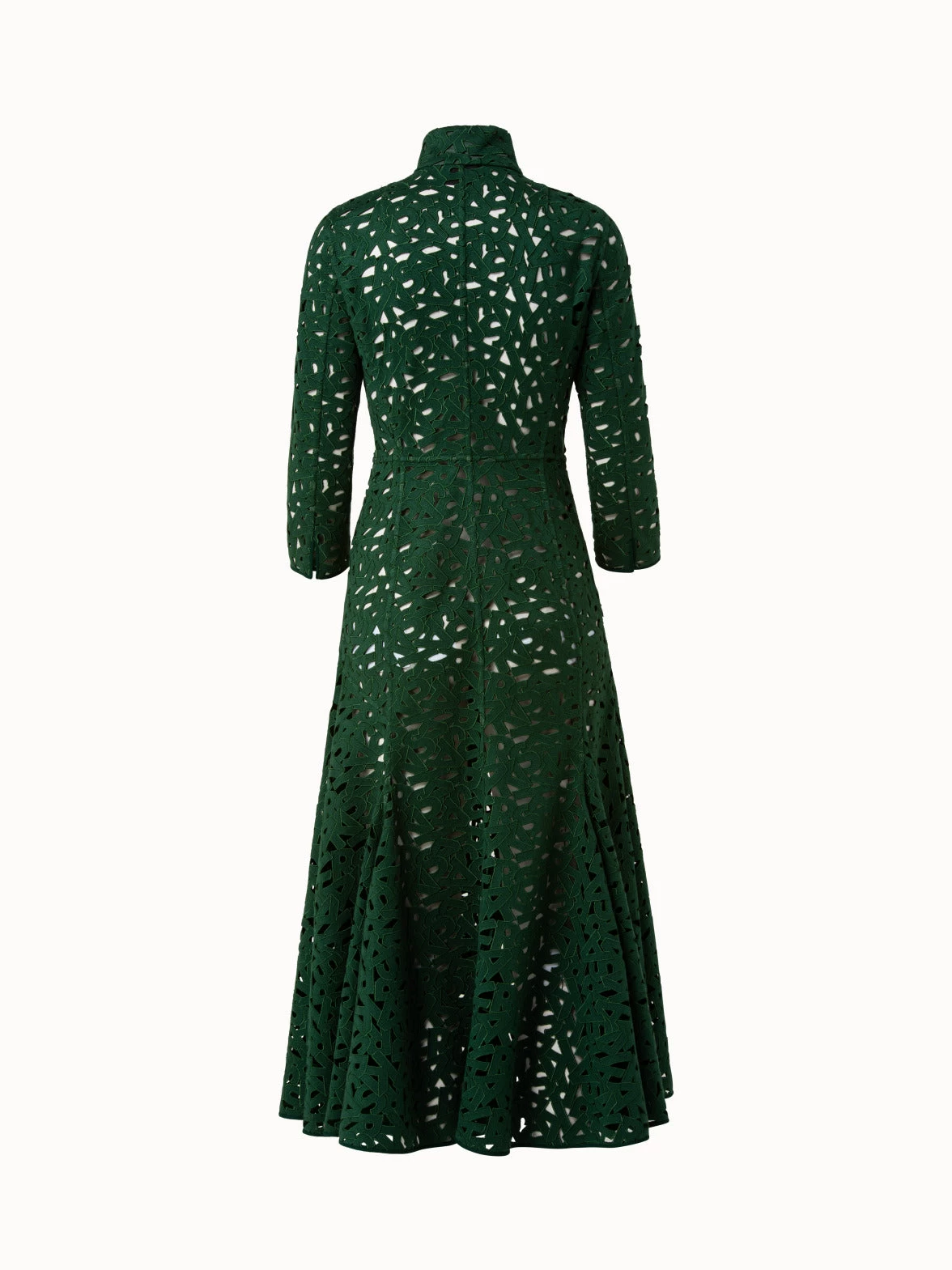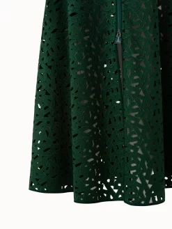 This long dress in second glance embroidery displays exquisite craftsmanship using a centuries old technique developed in St. Gallen. The silhouette hugs the body through the hips and the a-line skirt adds lightness and movement. Features a front zip closure and pockets.