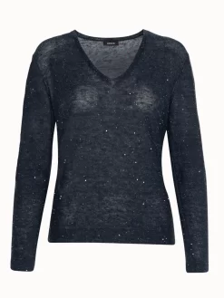 Feel the softness of linen with this designer pullover. The starry design makes it trendy while remaining discreet. Casual elegance at its best. Features a v-neck and will be easy to mix and match, for example with wide leg pants in navy.