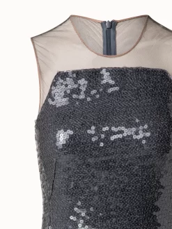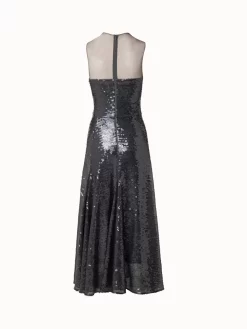 Make a statement in the Akris midi dress. Crafted in sequins on silk, it is equally elegant and extravagant. The sleeveless tulle shoulder panel features a round neck, while the sequin bodice is cut in a sharp apron shape. The A-line skirt creates shimmering movement with every step.