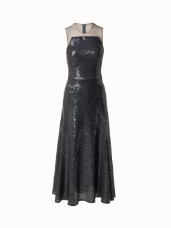 Make a statement in the Akris midi dress. Crafted in sequins on silk, it is equally elegant and extravagant. The sleeveless tulle shoulder panel features a round neck, while the sequin bodice is cut in a sharp apron shape. The A-line skirt creates shimmering movement with every step.