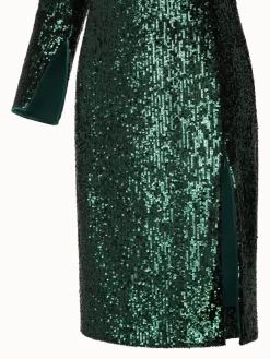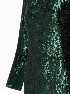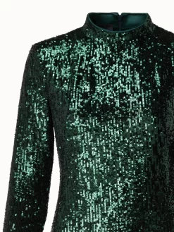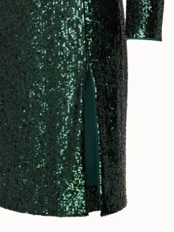 Perfect for the party season, this Akris dress stands out in all-over sequins on jersey. The slight mock neck with back zip, long sleeves, and side slits create a flowing silhouette that will shine beautifully wherever you go.