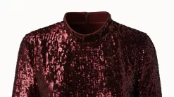 Just in time for the holidays, this sleek cocktail dress is crafted in sequins on jersey fabric, offering a comfortable stretch. The silhouette effortlessly molds to the body, while the mock neckline and long sleeves add a cheeky contrast to the high side slit.