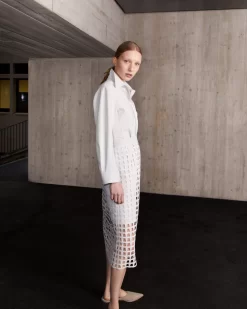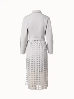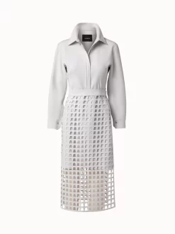 This striking set combines a fitted short dress crafted in sophisticated cotton silk stretch double-face with a modern apron wrap that pays homage to the early beginnings of Akris. In 1922, the house was founded by Alice Kriemler-Schoch as an atelier for aprons. In this modern interpretation, the dress features volume sleeves, front zip closure, and concealed zip pockets. The apron wrap creates a geometric and airy overlayer.