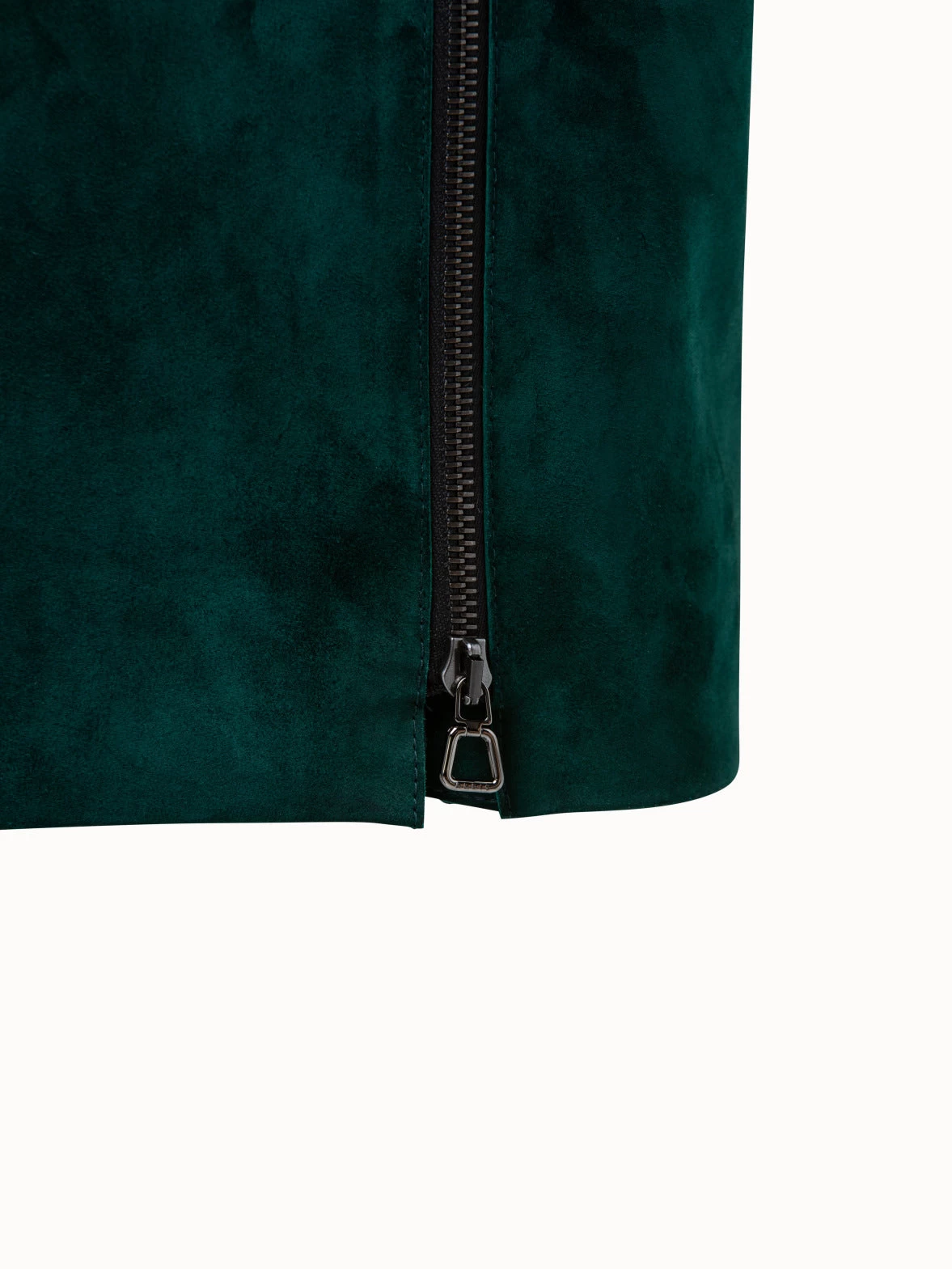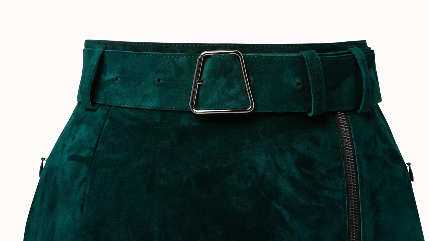 Short lamb suede wrap style skirt with trapezoid buckle, zip pocket, and back zip closure.