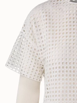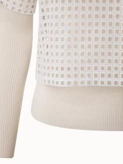 The cropped blouse is crafted in modern, geometric cotton Broderie Anglaise. It features a round neck, closes with a color-matched back zip, and is cut with elbow-length sleeves. The underlying Akris seamless pullover is crafted in lightweight silk and cotton blend rib knit. It features a round neck, long sleeves, and is cut for a close fit.