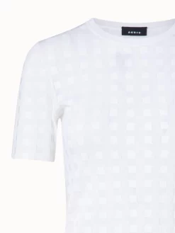 This short sleeve Akris pullover is crafted in a silk and cotton blend square jacquard knit. The intricate fabric elevates this essential to create a sleek underpinning and stand-alone piece for spring and summer.