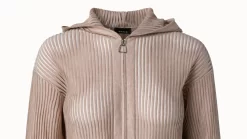 Smart and sporty knit hoodie in silk cotton transparent structured lines. It has front zip closure and long sleeve.