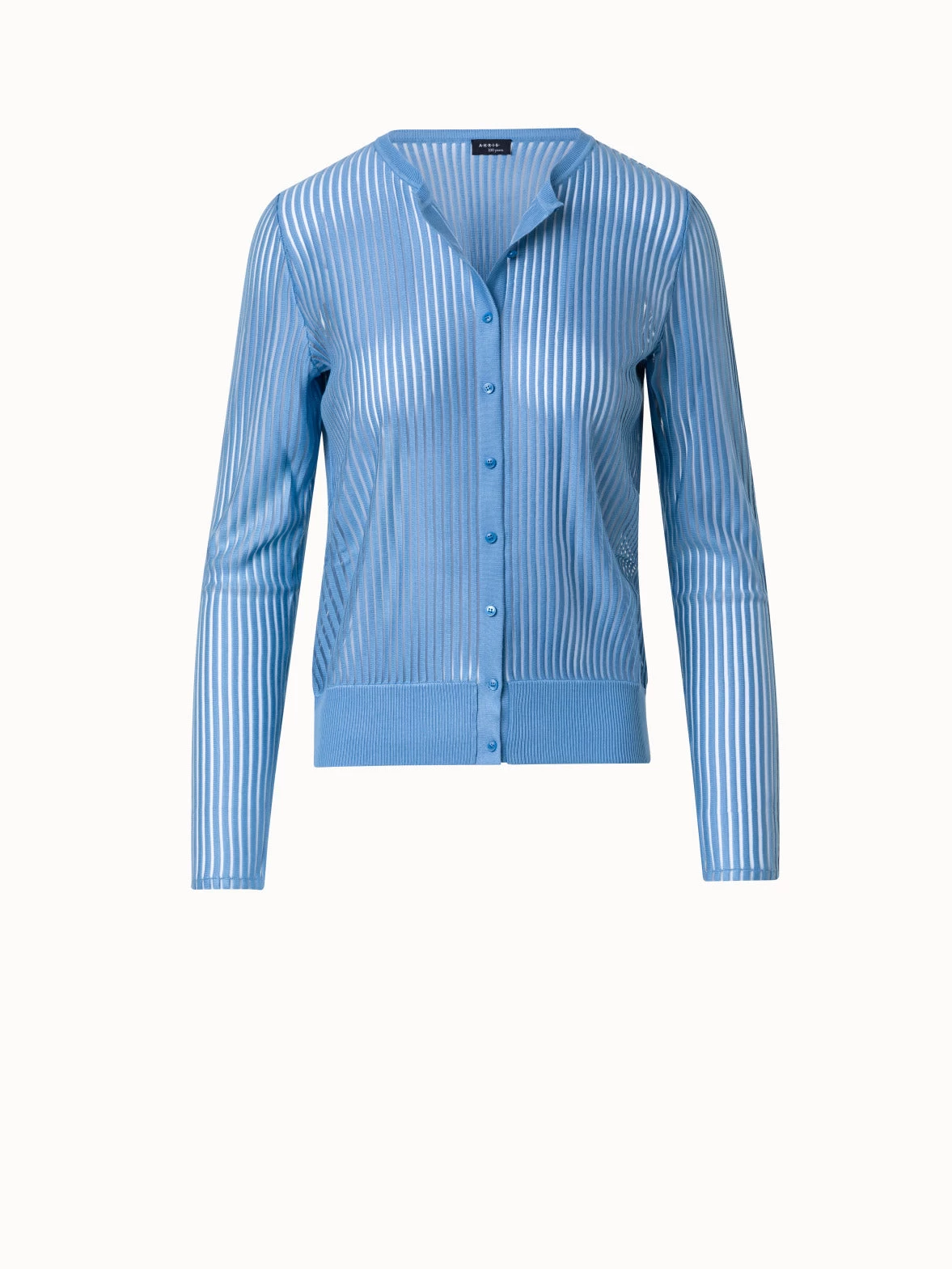 This Akris cardigan is crafted in a silk and cotton blend knit with structured stripes. The semi-transparent fabric creates an airy look and feel, making it perfect for spring and summer days.