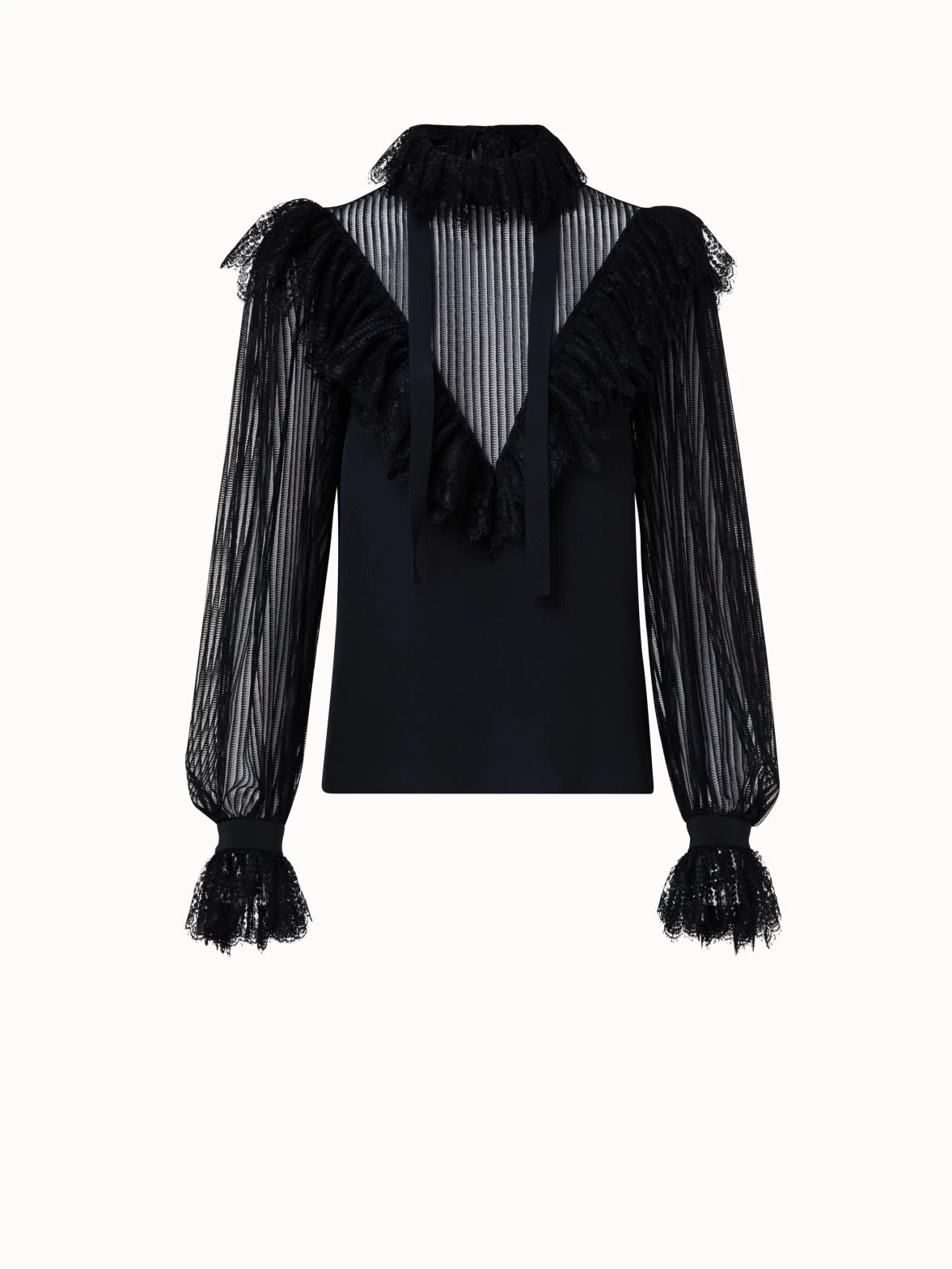 “This blouse is a recreation of a vintage Akris design from the 1980s. It is crafted in silk crêpe and two types of lace. Stipes create a sensual look around the neckline, shoulders, and sleeves, while the ruffled lace adds to the vintage appeal. The tie- ribbon allows for personal styling options. Closes with a back zip.