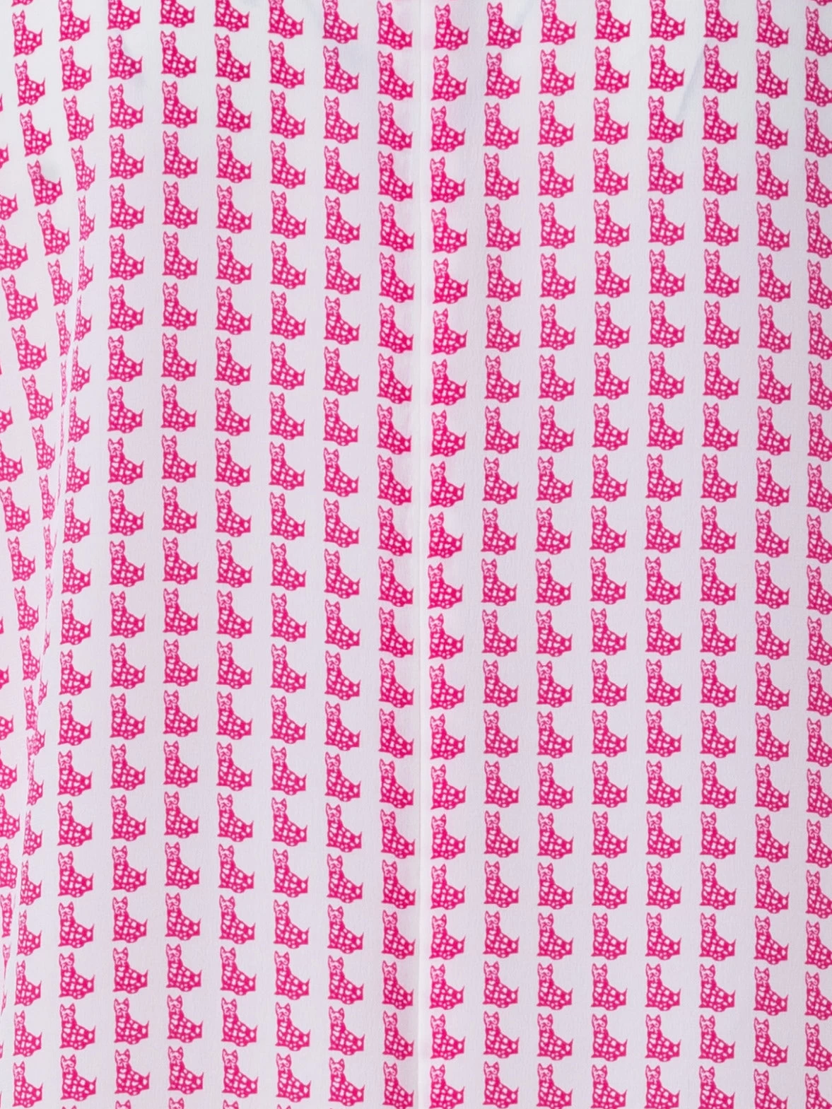 This Akris tunic blouse is crafted in silk crêpe with Emma print. The all-over Emma motif is a playful, witty reminiscence of a 1970s design by Max Kriemler and renamed after creative director Albert Kriemler’s dog. The blouse features a round neck with front slit hook closure. The dropped shoulders and volume elbow-length sleeves create a modern silhouette. The detachable bow allows for versatile styling.