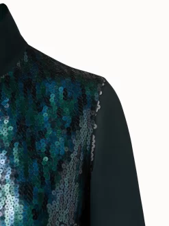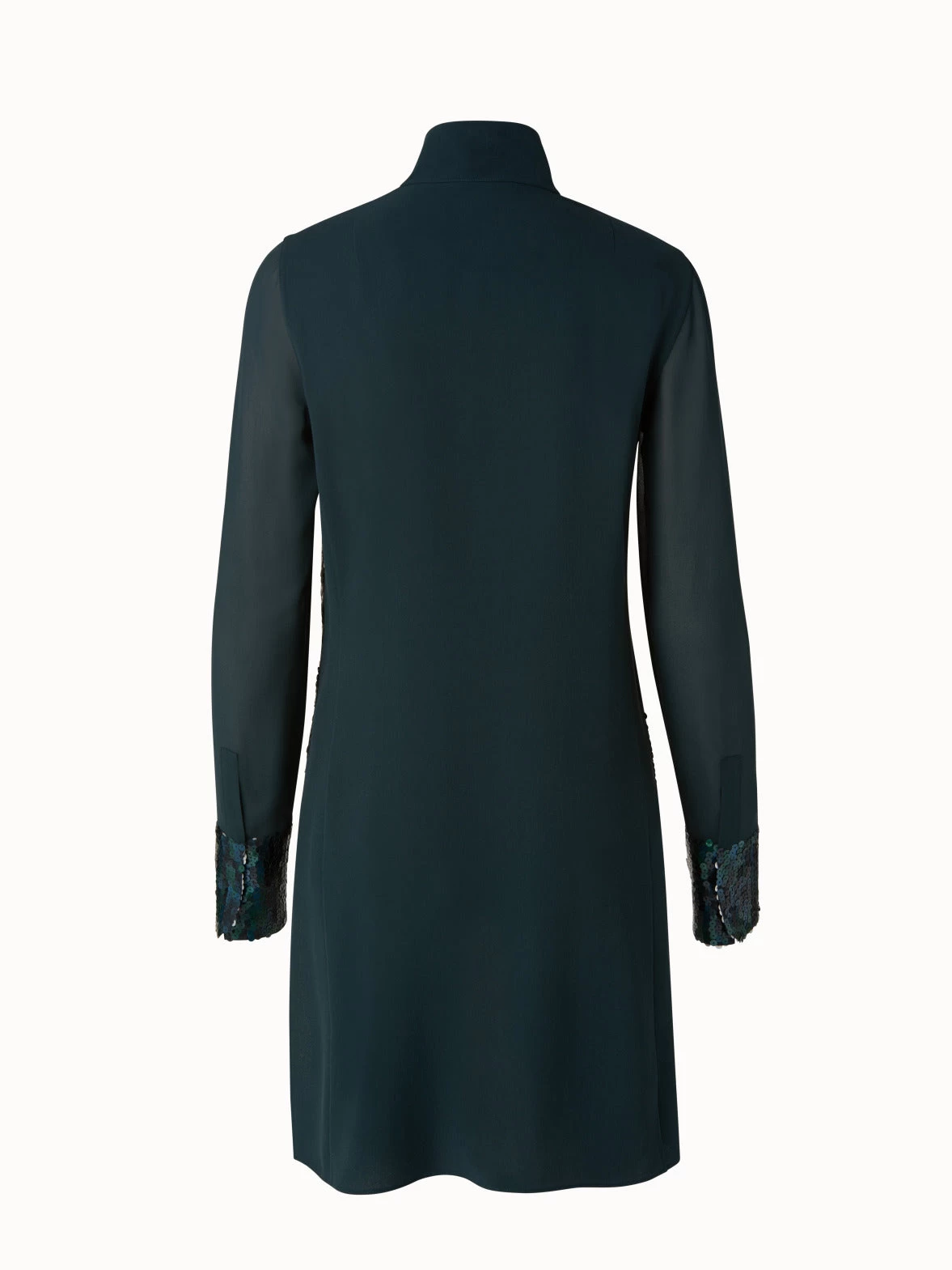Add a dazzling touch to your evening wardrobe with this Akris tunic blouse. It is crafted in silk georgette with sequins front and sleeve cuffs. It is longer in the back and features a mock neck.