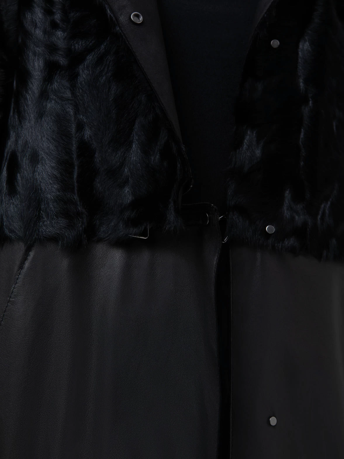 This convertible lamb nappa blouson jacket with detachable silk lamb top exemplifies craftsmanship and versatility. With sporty details like the zip off hood and sleeves, you can take this jacket from day to night. Designed with a button front closure, slash seam pockets and an elastic hem.