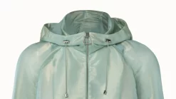 This Akris Grazielle blouson jacket is made from silk techno iridescent organza. It has a voluminous silhouette with raglan sleeves and patched pockets that are emphasized by a drawstring at the hem. It features a stand-up collar, a concealed hood, and front zip fastening. The ideal versatile option to dress up or down and a light layering piece for spring and summer.